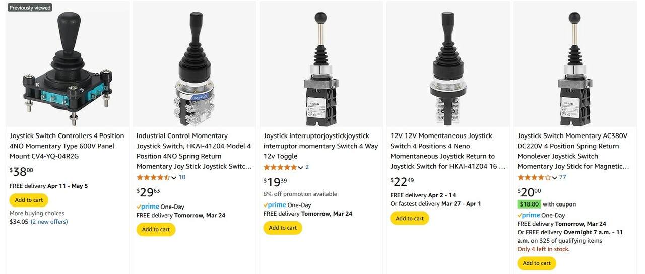 They are cheap because they are simple on/off switches - rather than proportional control joysticks that cost big bucks and need way more electronics than a bunch of 12v relays... small enough you could use fingertips to operate them - mounted in a waterproof box with a big magnet on the bottom and some weather pack connectors it could sit on your fender in easy reach and also be easy to remove if you weren't using your johnny bucket...