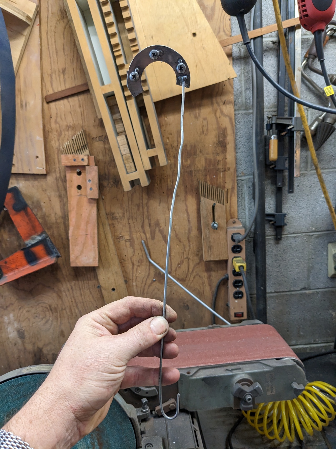 Next I prepared it to be fished in place through the gas cap hole. I ran it through the bandsaw to cut it into two slices, and then tack welded a piece of steel wire to each piece. Those wires can be bent to whatever shape I need in order to push each slice through the gas cap hole and then maneuver it into position.