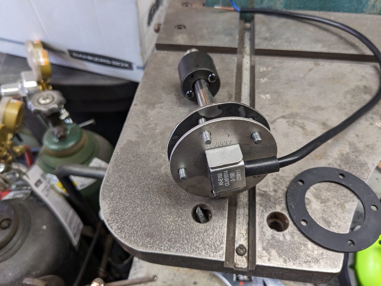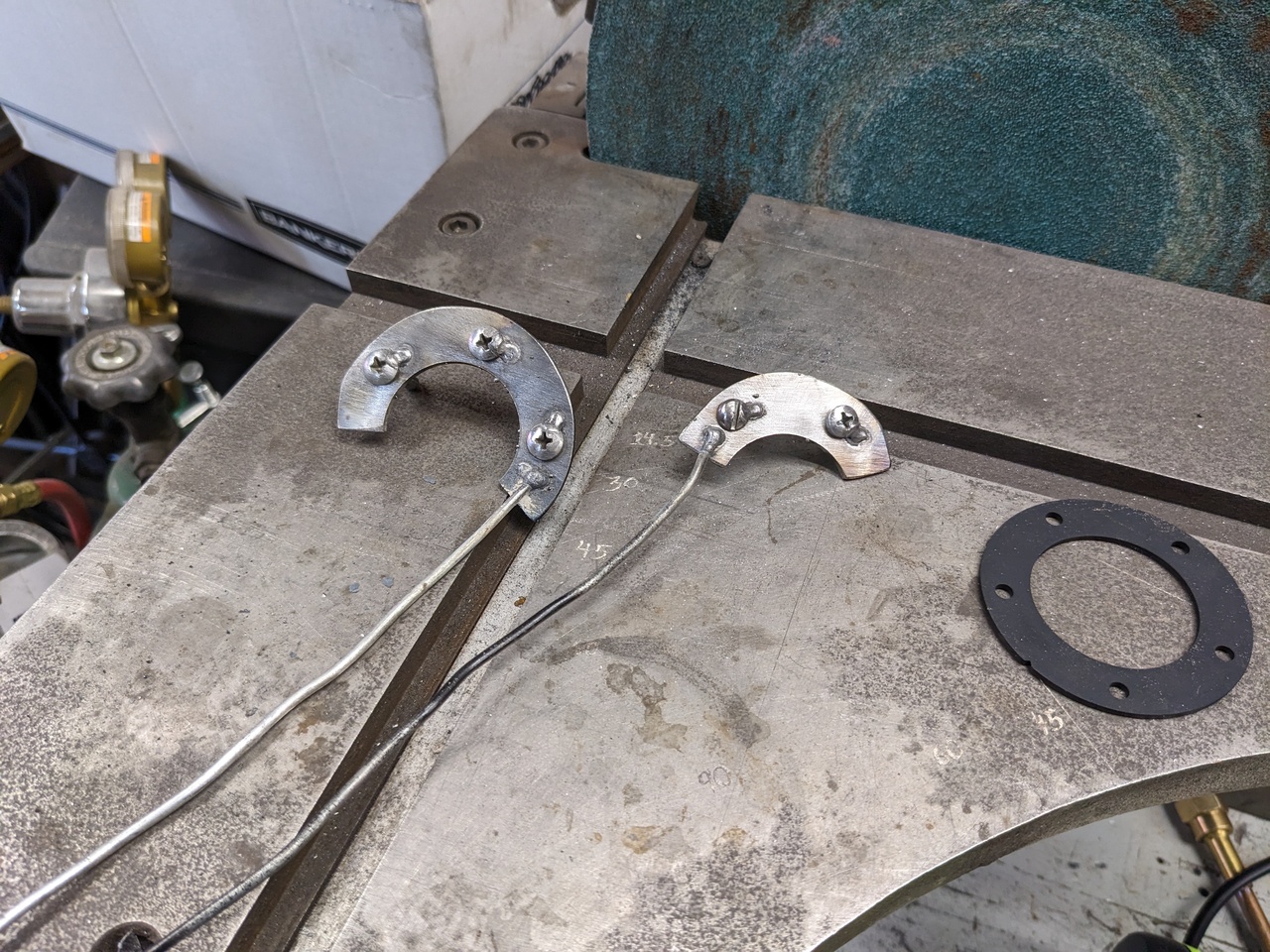 This step was made harder than it should have been by the necessity to bolt everything in offset to the right side of the hole. That meant that I had to insert the sender float before I could wiggle the flanges into their final location. It was fiddly, but not crazy. I went ahead and torqued all five nuts (gently) before I roughly wiggled the fishing wires back and forth to cause them to "wring off" right at the point that they were tack welded.