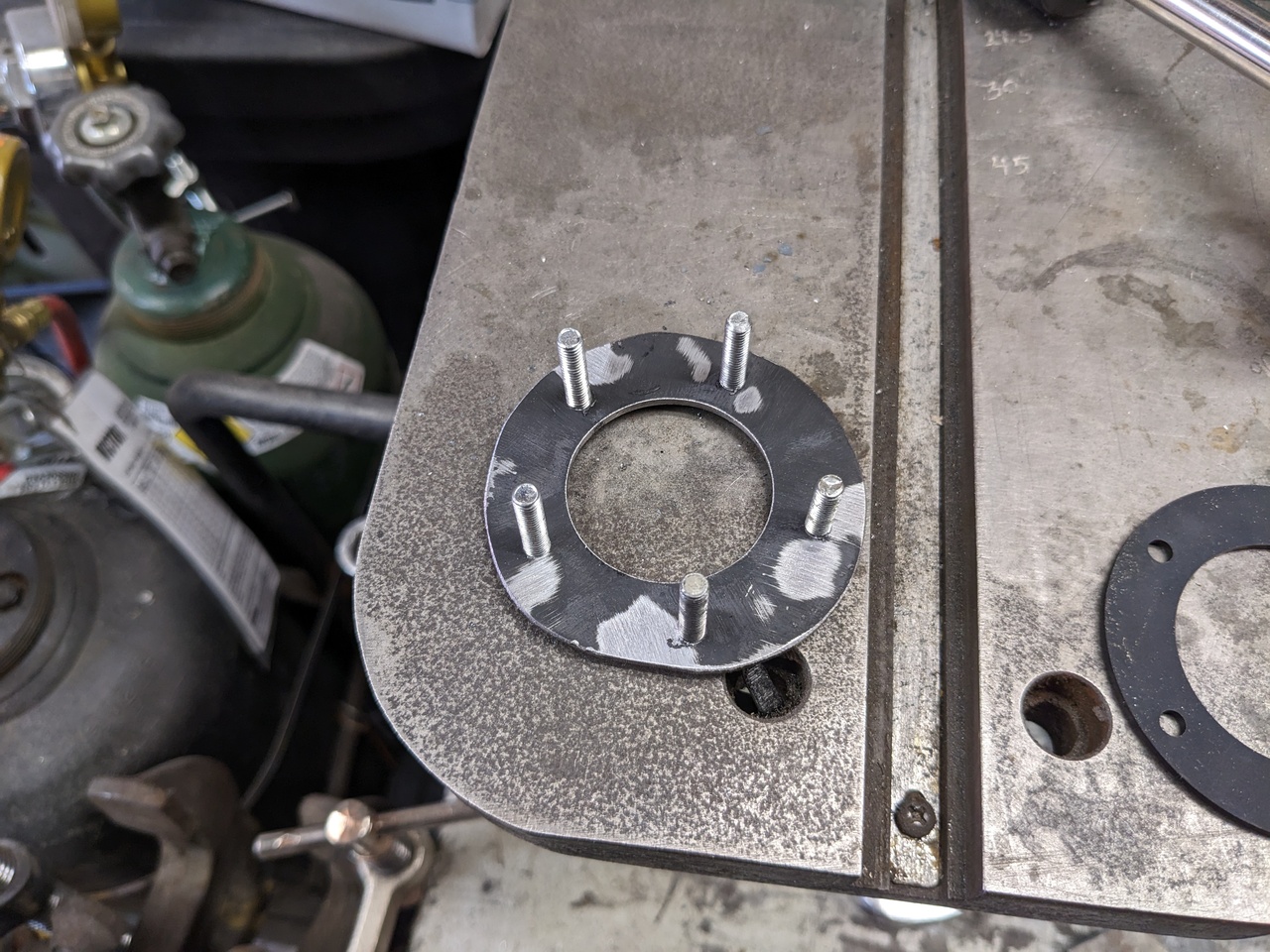 In preparation, after a great suggestion by @DavidBarkey , I created a flange with threaded studs to go inside the tank, with the studs sticking upward. I just cut out a 1/16" plate steel ring, drilled it to match the holes in the fuel sender, and tapped it for screws (#10-32). I then screwed the screws all the way in, and tack welded the heads to the ring, so now those permanent studs will stick up through the holes in the sender flange.