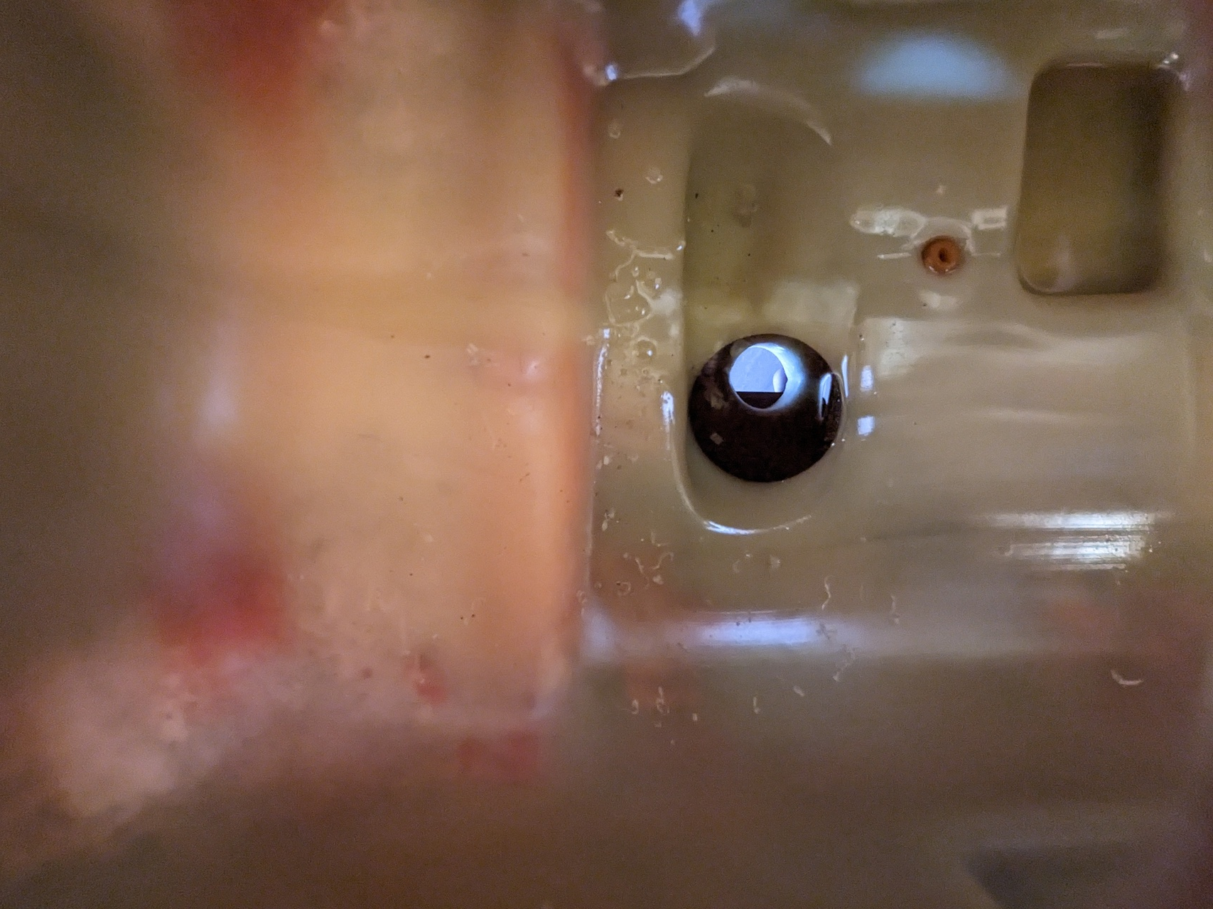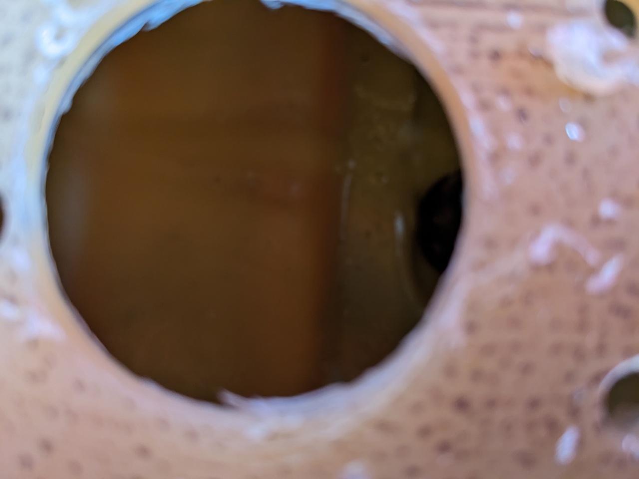I made a mistake here, and barely mitigated it: I didn't realize that the floor of the tank isn't flat. There's a raised ridge, particularly over on this left side where I've drilled.