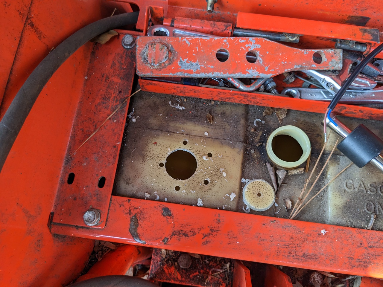 I fished a multi-conductor cable (What I'd refer to as "hvac thermostat wire) down into the frame area and back to underneath the fuel tank. I'd need to remove the deck to really zip tie the cable perfectly in place, so the next time I'm under the machine without the deck in place I'll do that. For now it's laying in a safe-ish channel, not likely to get pinched or snagged. The sender has two wires, one to 12V ground, and the other to gauge sender input.