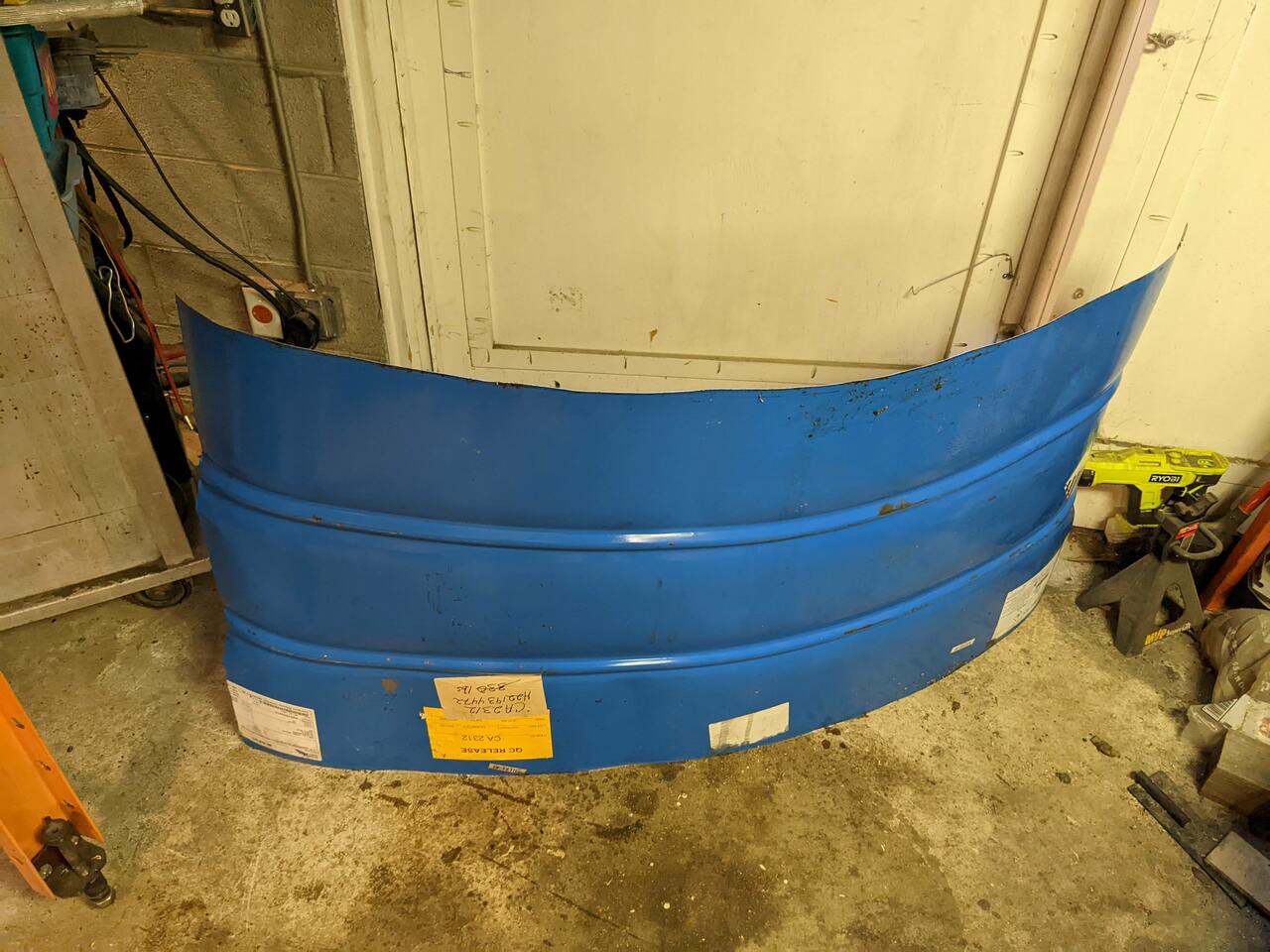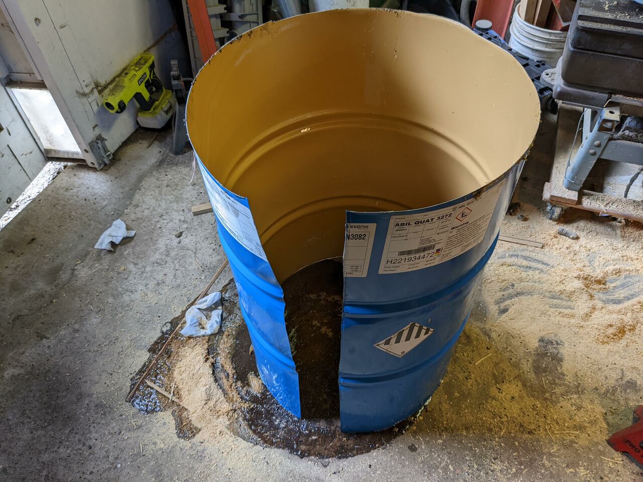 Then I sliced the barrel lengthwise and cleaned the inside out. The barrel contained some kind of water soluble emolient, and its only warning label was "harmful to aquatic life". So I had to be careful not to let any of it wash into the yard or down to the stream. So I had to go through a bunch of paper towels to mop it up and wipe it clean.