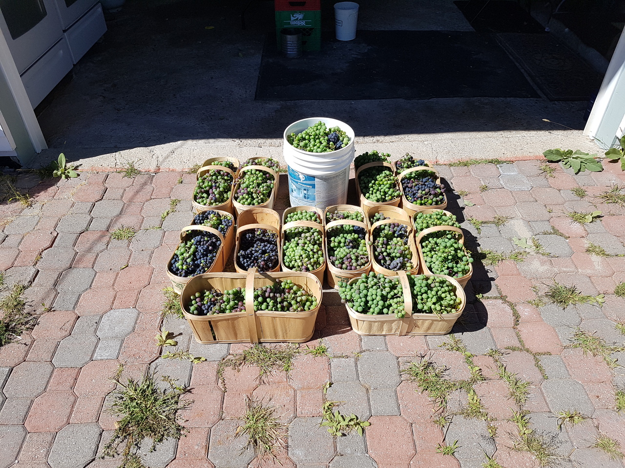 This is what we got off our 4 grape vines this year . They grow up and over our pergola for shade in the summer .