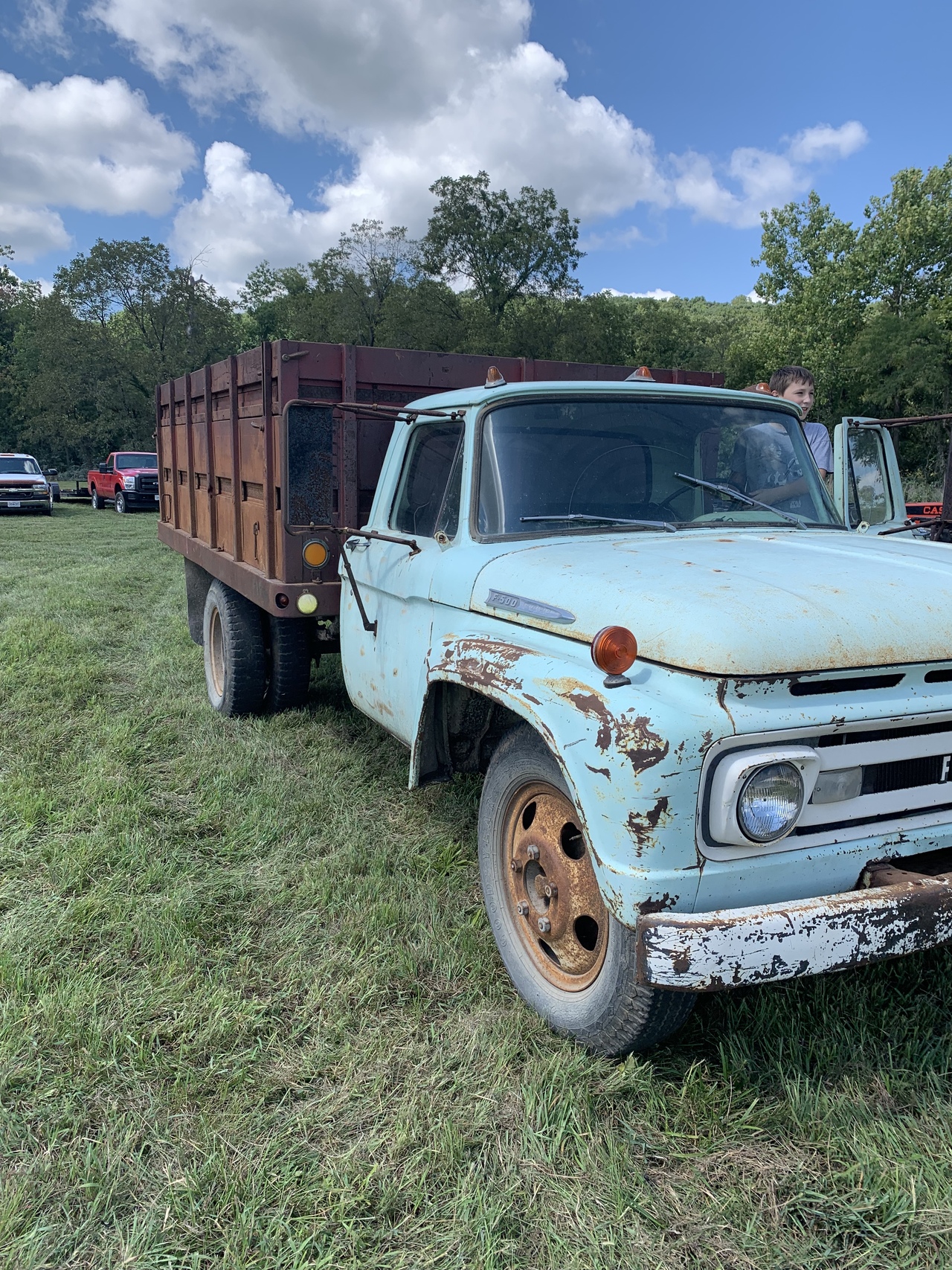 1961 Ford F500 grain truck. I think a 293 V8. 4 speed. Has hydraulic 13 foot dump bed. The truck runs but has no brakes. Im hauling it home tomorrow. Price was $550 ]