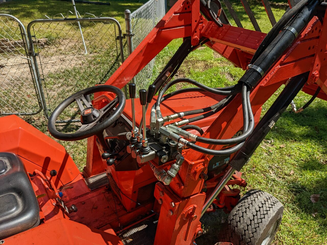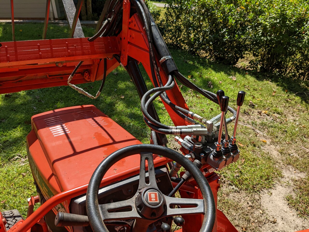 Well, an update: The new valve is wider than the old one, WHICH means that it has to slide outboard from the old one. WHICH means that it's now directly behind and will be hit by the loader arm at full raise position. WHICH means it also had to slide an inch and a quarter aft toward the operator. So I made up a new 3/16" plate steel mounting plate, and welded it in and painted it and tapped it for a pair of 5/16" bolts and clamped it down.