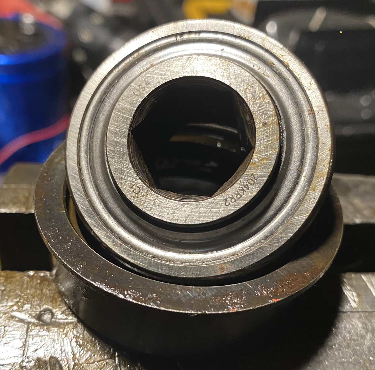 For the auger I got a couple of new Fafnir 204KRR2 bearings, which have the outer diameter smaller than the original bearings, and need a sleeve. I will make sleeves for these out of the outer race of the old bearings.