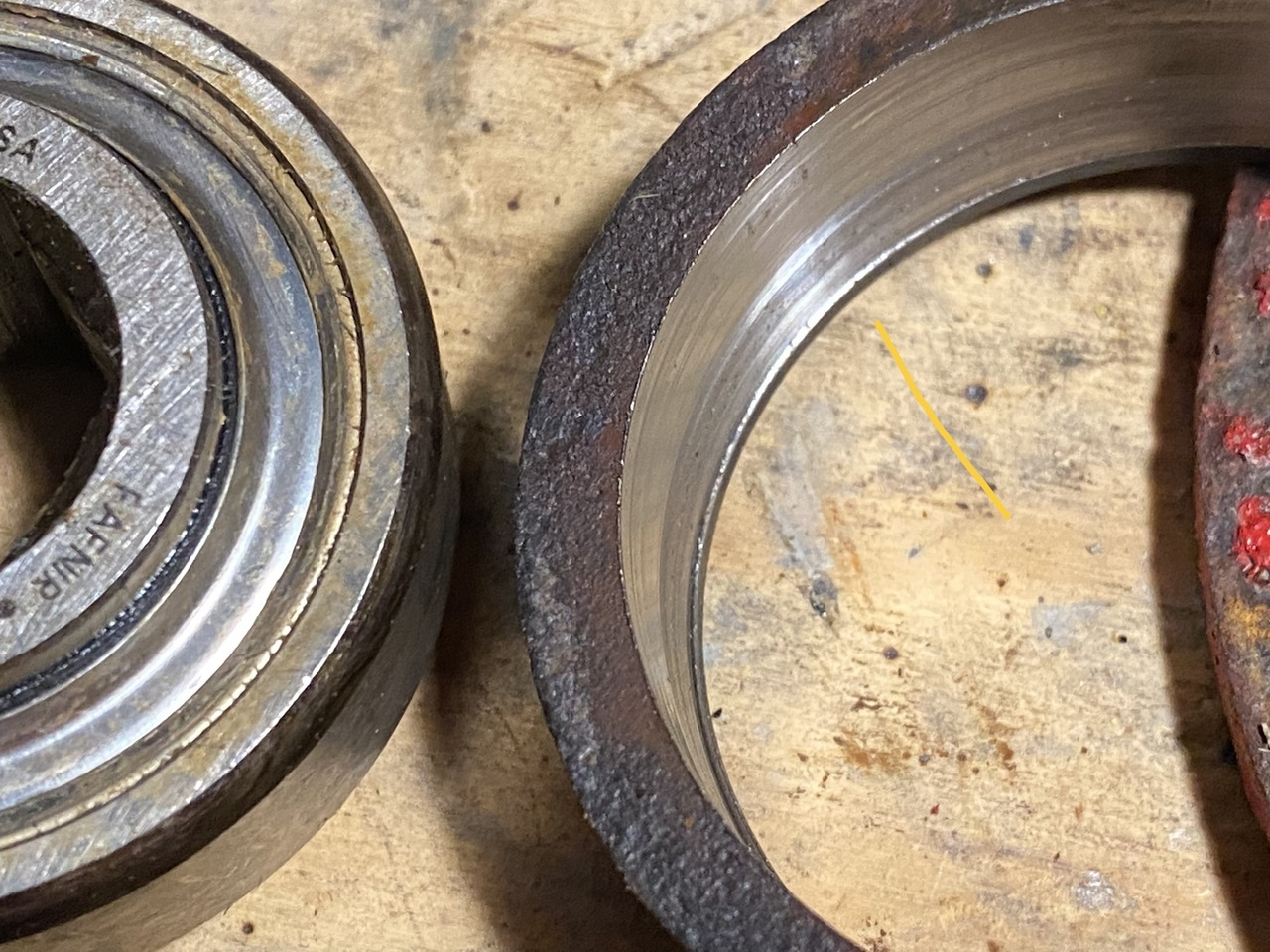Allow them to cool off at room temperature. Then slowly take off material on the interior with the lathe. The original bearings have an outside lip that keeps them from falling off inside the auger. I left a lip about 1/16" on the inside of the sleeve so that the smaller bearing does not fall inside either.