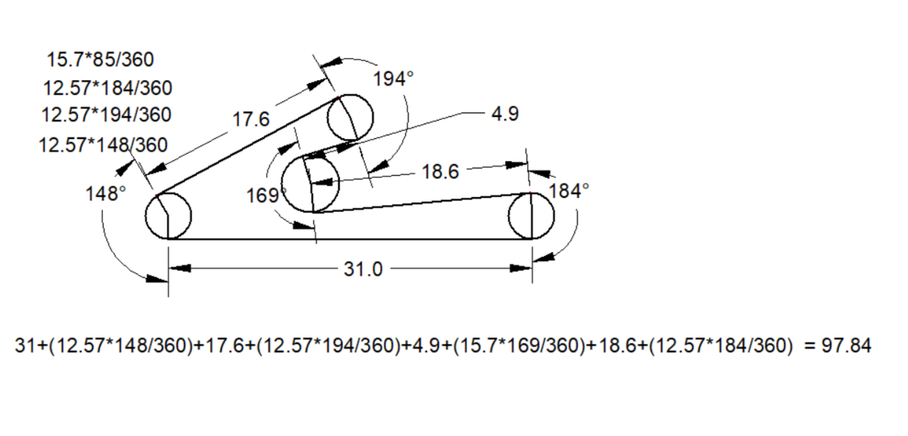 Time for a sanity check: I know that the stock belt is right around 82". So I add up the lengths of the straight belt, plus the arc lengths where the belt wraps the pulleys. And it all adds up to about 82". So my model isn't insane.