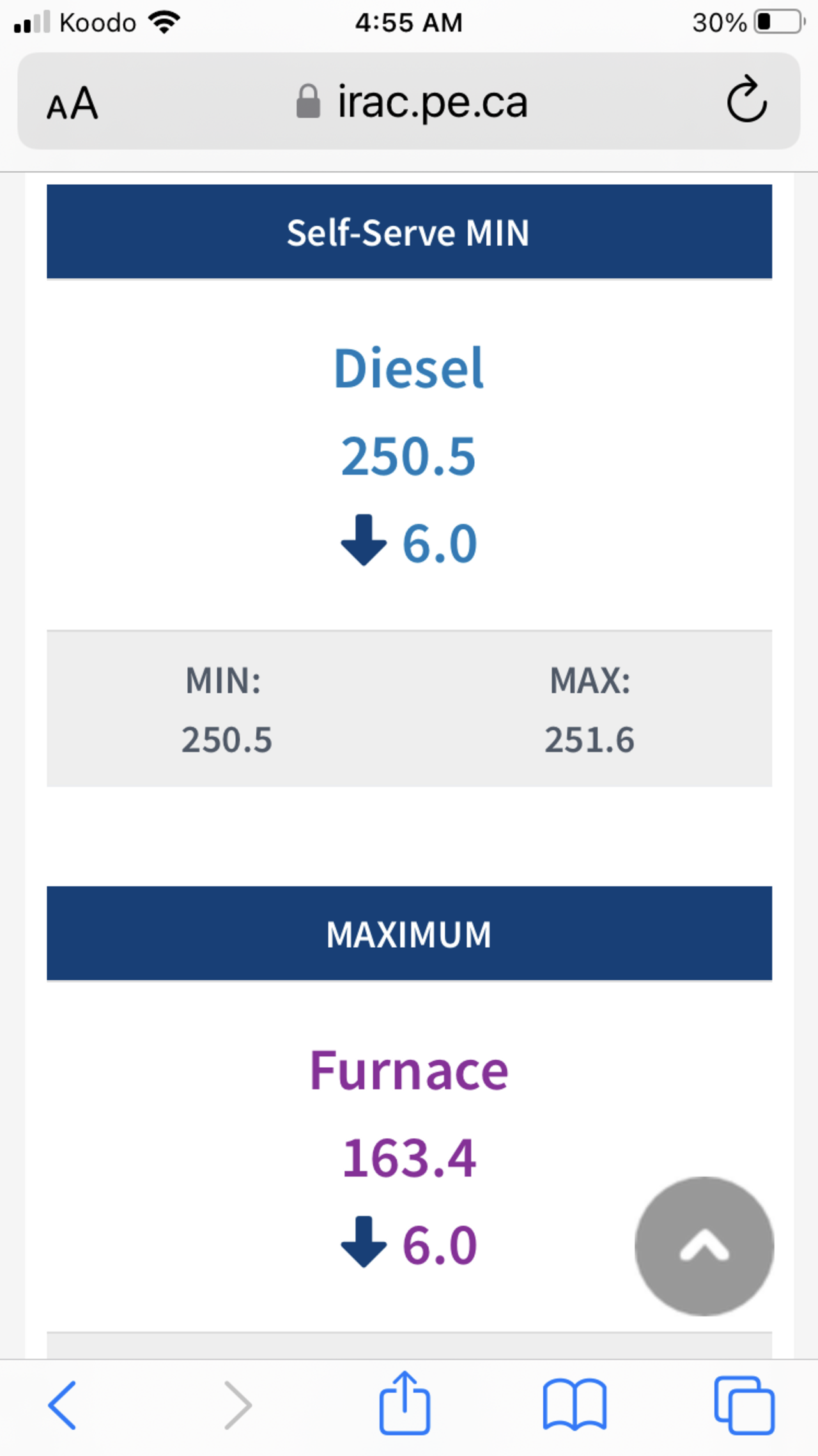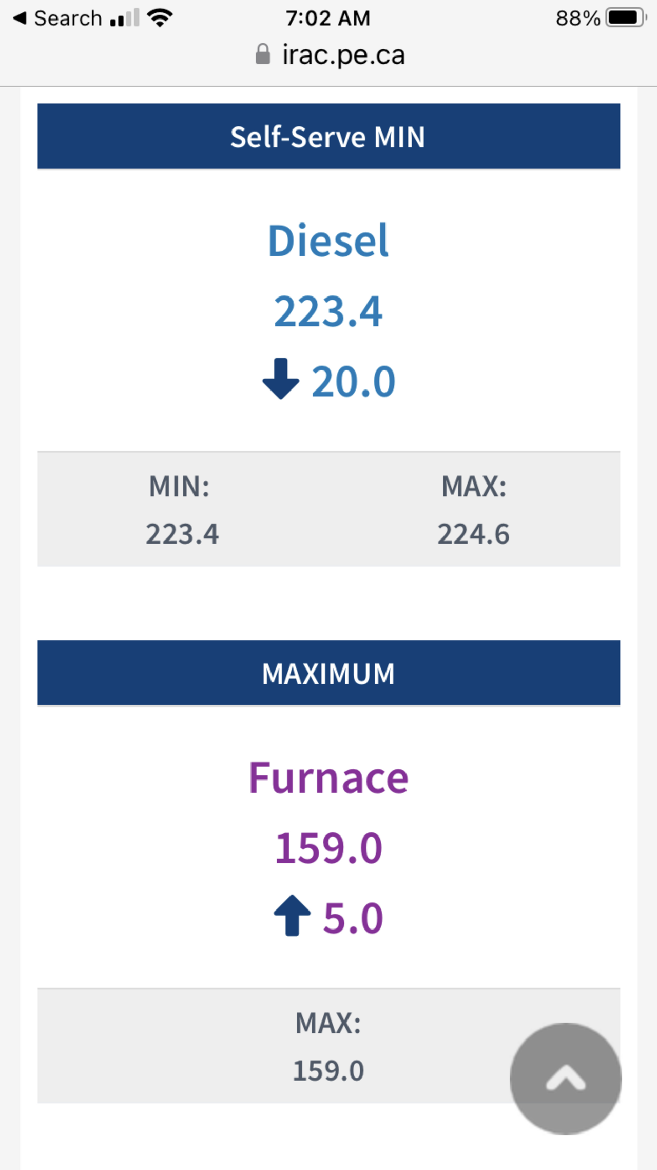 So for our normal price hike day, no change in gasoline, but diesel and oil up 2.5 cents per litre.