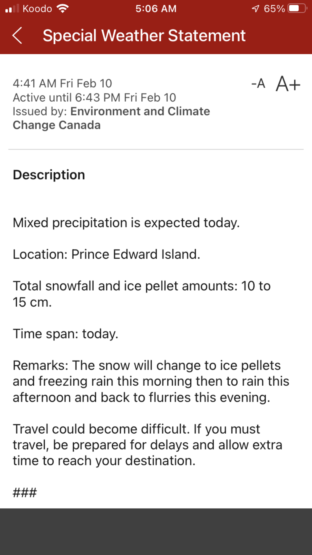 Weather today is nice. 8C now. But tomorrow nasty. Snow , ice pellets and freezing rain. Monday back up to 8C and rain.