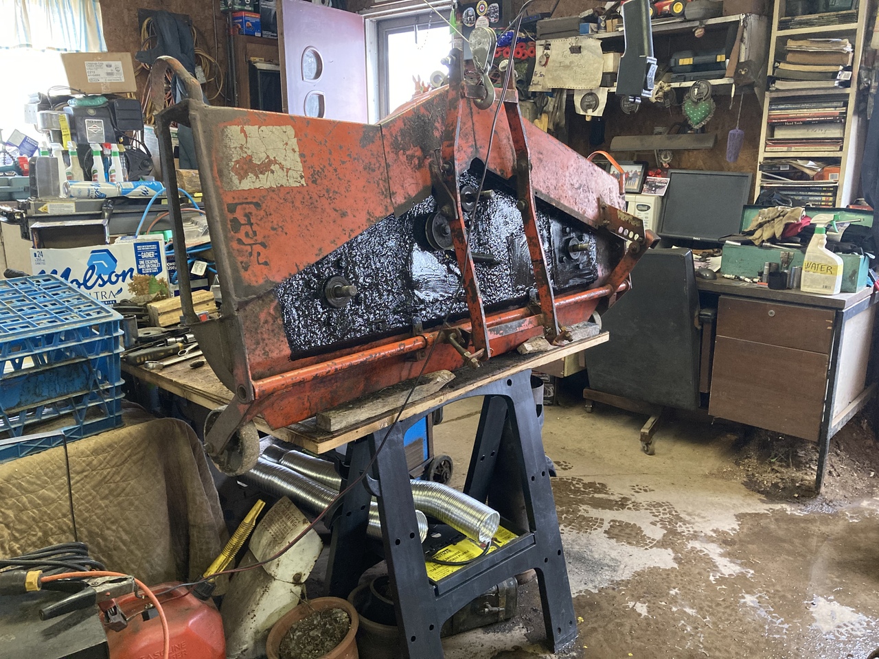 So I’m getting there. Found some Home Hardware semi gloss black rust paint in the cabinet. It’s only 5 years old or so, almost new paint ! So slopped that on today. Tomorrow I’ll see if I can get the pulleys back on, and get the belt installed. Have a little welding underneath to do. Only a few minutes worth. Not sure what it’s called, but it’s sorta a slide to help keep the deck from digging in, in the middle of the deck at the back. Some decks, like my MF 14 or the YT16H ford has rollers there.