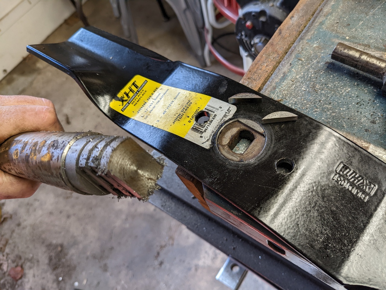 Finally I welded in bolts in the 3/8 bolt holes. The bolts stuck upwards into the 3/8 holes in the blade, locking the new adapter's rotation to the blade's rotation.