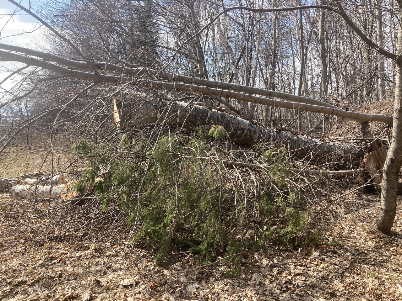 Birch trunk all cut up today. And once I got the truck off noticed the maple trees started going back up. Root was almost up at 90 degrees, now after a few hours it back down to about 30 degrees. I doubt the maple trees will stand up straight, but as things settle more and they start to grow, they may not be to bad.