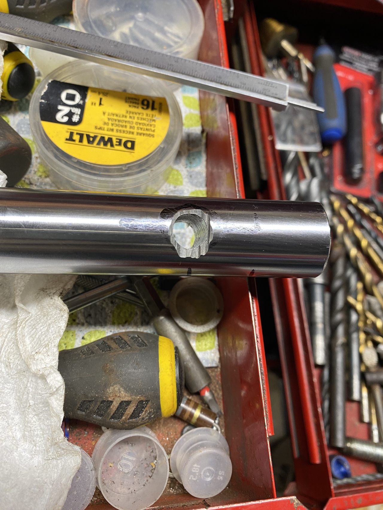Thought I'd end the night with drilling the end hole in the stabilizer cylinder 1" new rods. The machinist who did the other end, the thread, told me it's hardened and recommended to grind some of the surface before drilling. All measured and marked and that's what I did, ground some of the surface before drilling. I was surprised that my punch still got dull when I tried to mark the hole start. Not only but the drill bit just wouldn't go in. Tried the tungsten carbide bit and that went further but I pressed too hard on it and broke it.