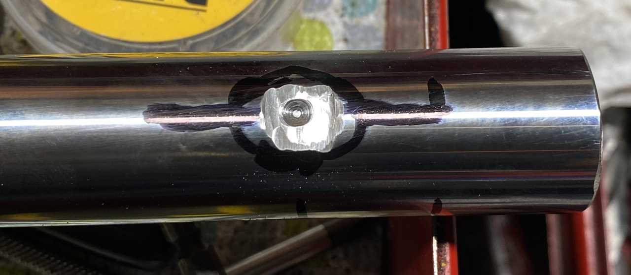 Thought I'd end the night with drilling the end hole in the stabilizer cylinder 1" new rods. The machinist who did the other end, the thread, told me it's hardened and recommended to grind some of the surface before drilling. All measured and marked and that's what I did, ground some of the surface before drilling. I was surprised that my punch still got dull when I tried to mark the hole start. Not only but the drill bit just wouldn't go in. Tried the tungsten carbide bit and that went further but I pressed too hard on it and broke it.
