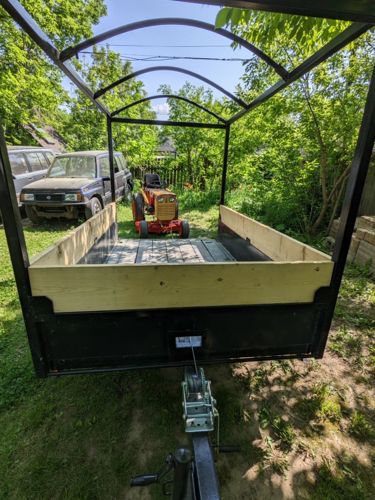But Wait!!! There's more to the story - This was the 2nd GT we've brought home with our new utility trailer... In my rush to get a few photos while it was sunny this afternoon I started unloading the 195 from the trailer, - Without a truck attached to the trailer hitch. :headbash: I realized it was missing the latch to hold the parking brake engaged (it has disc brakes on the rear axle) so I gently pushed it by hand towards the loading ramp, with wheel chocks in place so it wouldn't get away from me... I pushed it the last little bit so the back tires were just starting to touch the ramp when very gracefully the trailer did a gentle wheelie :cuss:
