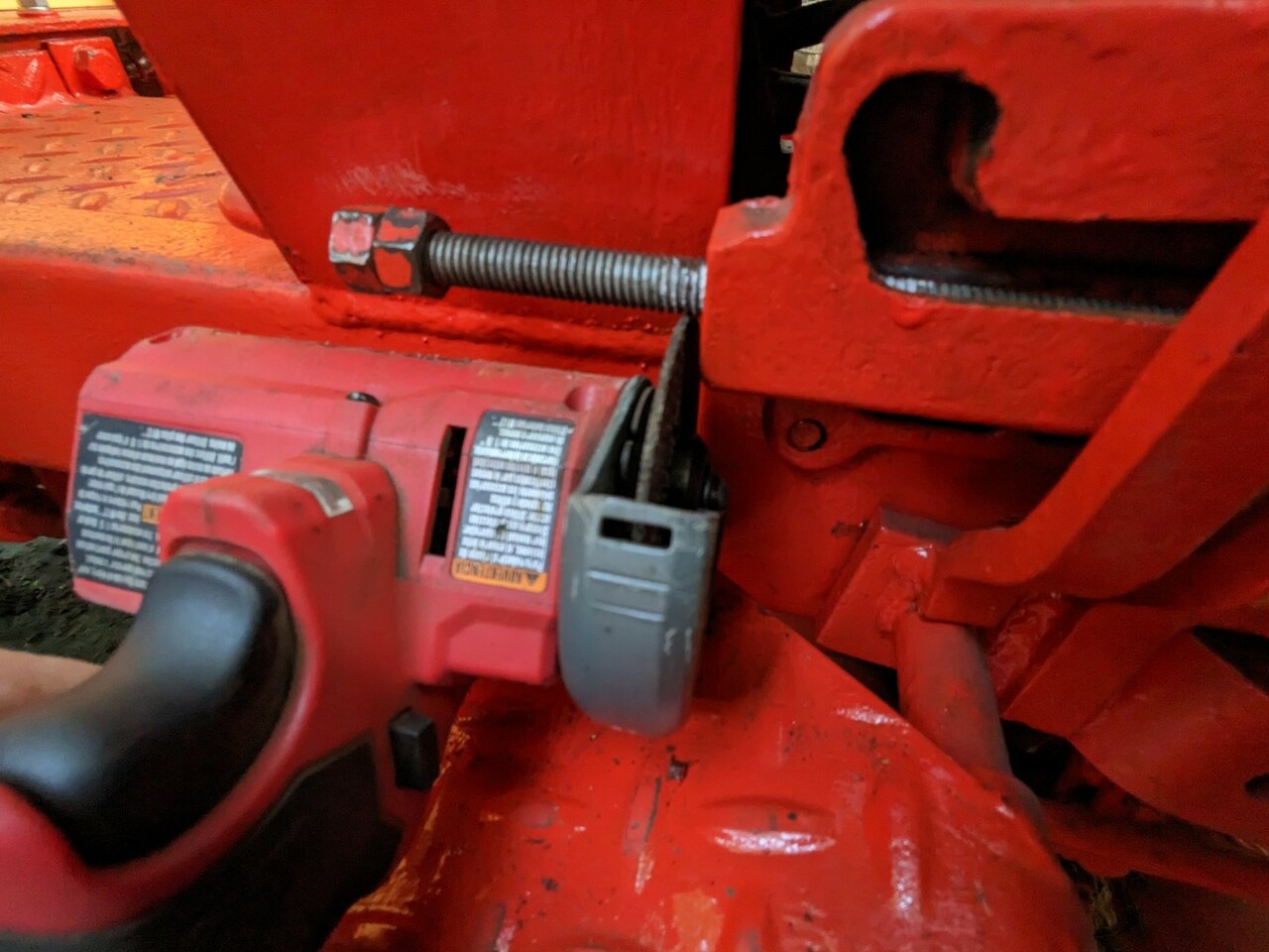 The attachment lever wouldn't latch into the "up" position. Poked around and found the height adjustment rod wasn't in the right place, it's possible when going on/off the trailer the deck might have pushed up too far towards the tractor. The "L" shaped adjustment rod stop was now behind the lever instead of in front of it, blocking the lift lever from pulling all the way back and locking into the notch. :headbash: