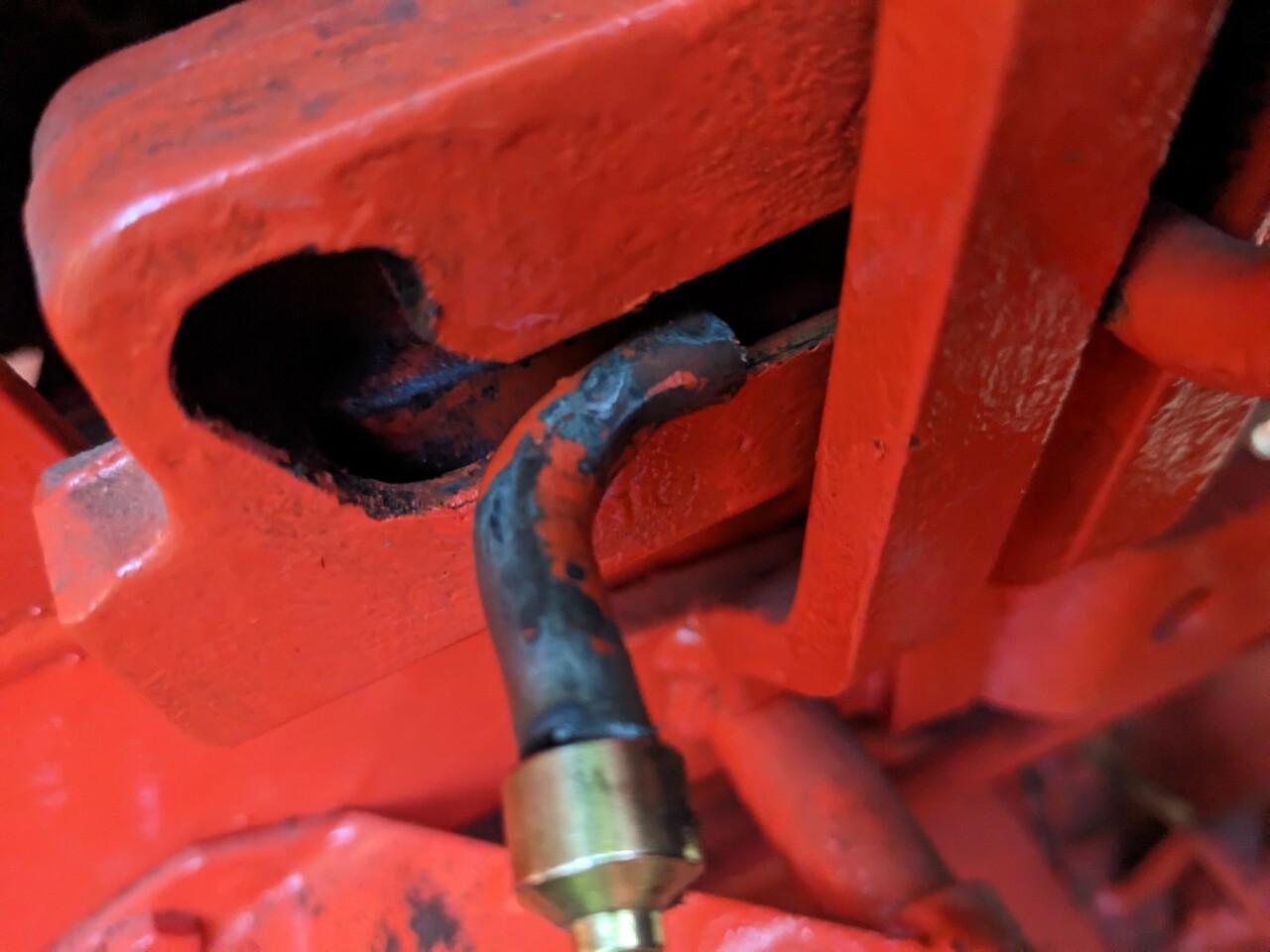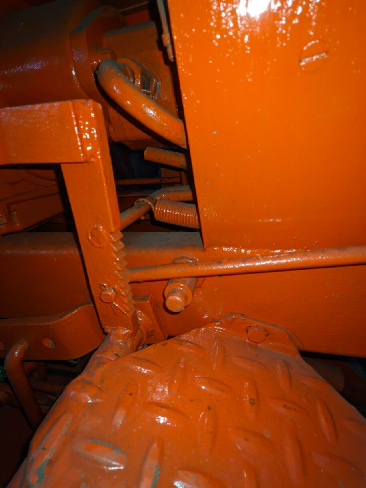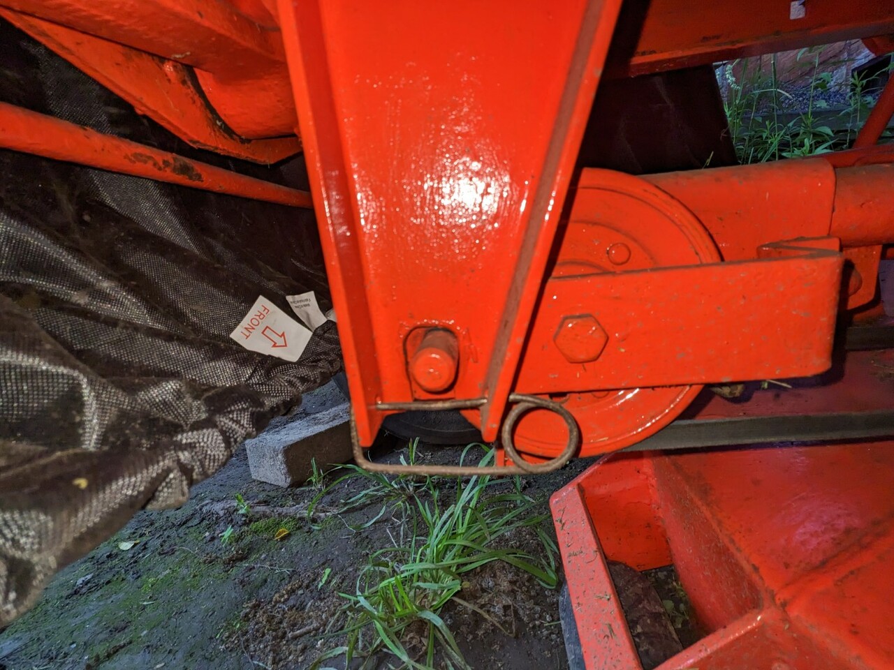 The attachment lever wouldn't latch into the "up" position. Poked around and found the height adjustment rod wasn't in the right place, it's possible when going on/off the trailer the deck might have pushed up too far towards the tractor. The "L" shaped adjustment rod stop was now behind the lever instead of in front of it, blocking the lift lever from pulling all the way back and locking into the notch. :headbash: