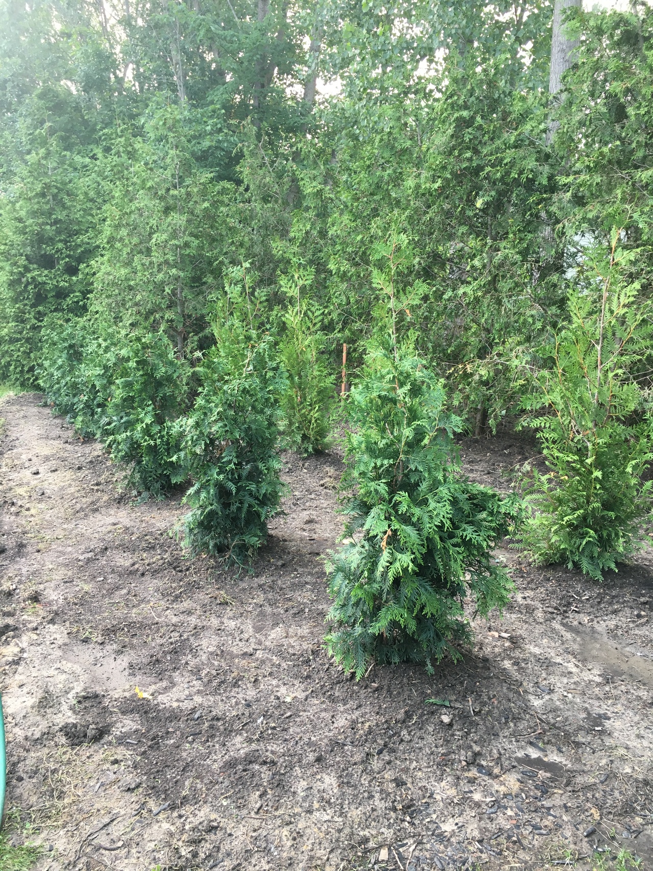 Fifteen new arborvitae trees planted in prepared bed. This could have never been possible without