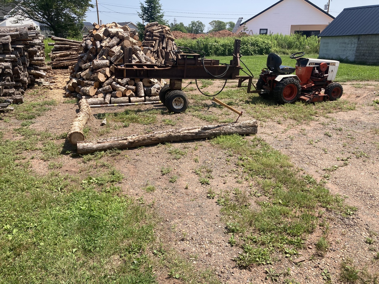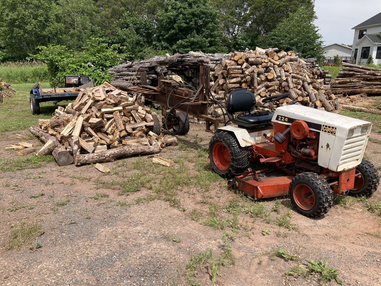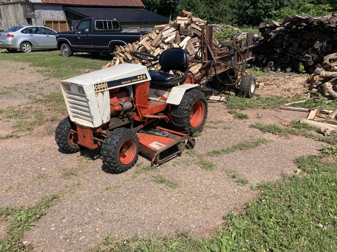 Hehe. Garden tractor does farm tractor work. Splitting wood today with the Case 224. Got some done. RPMs at 2500 to 2600. Hydraulic oil temperature at 120F. Worked great. Was fun to do. Back at the wood cutting Monday. Depending on weather.