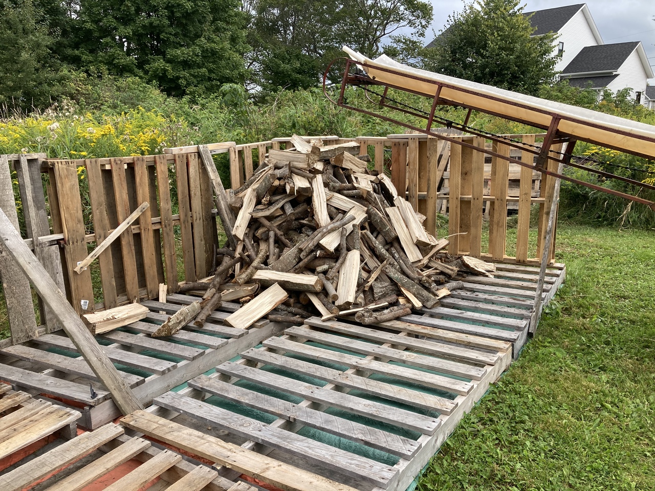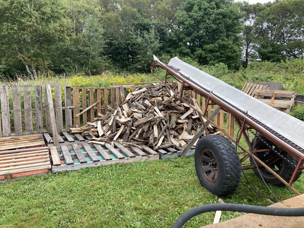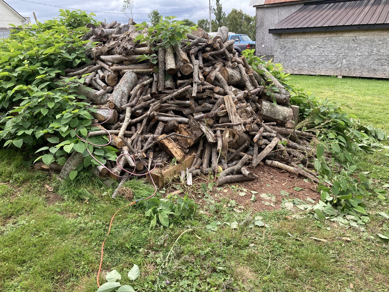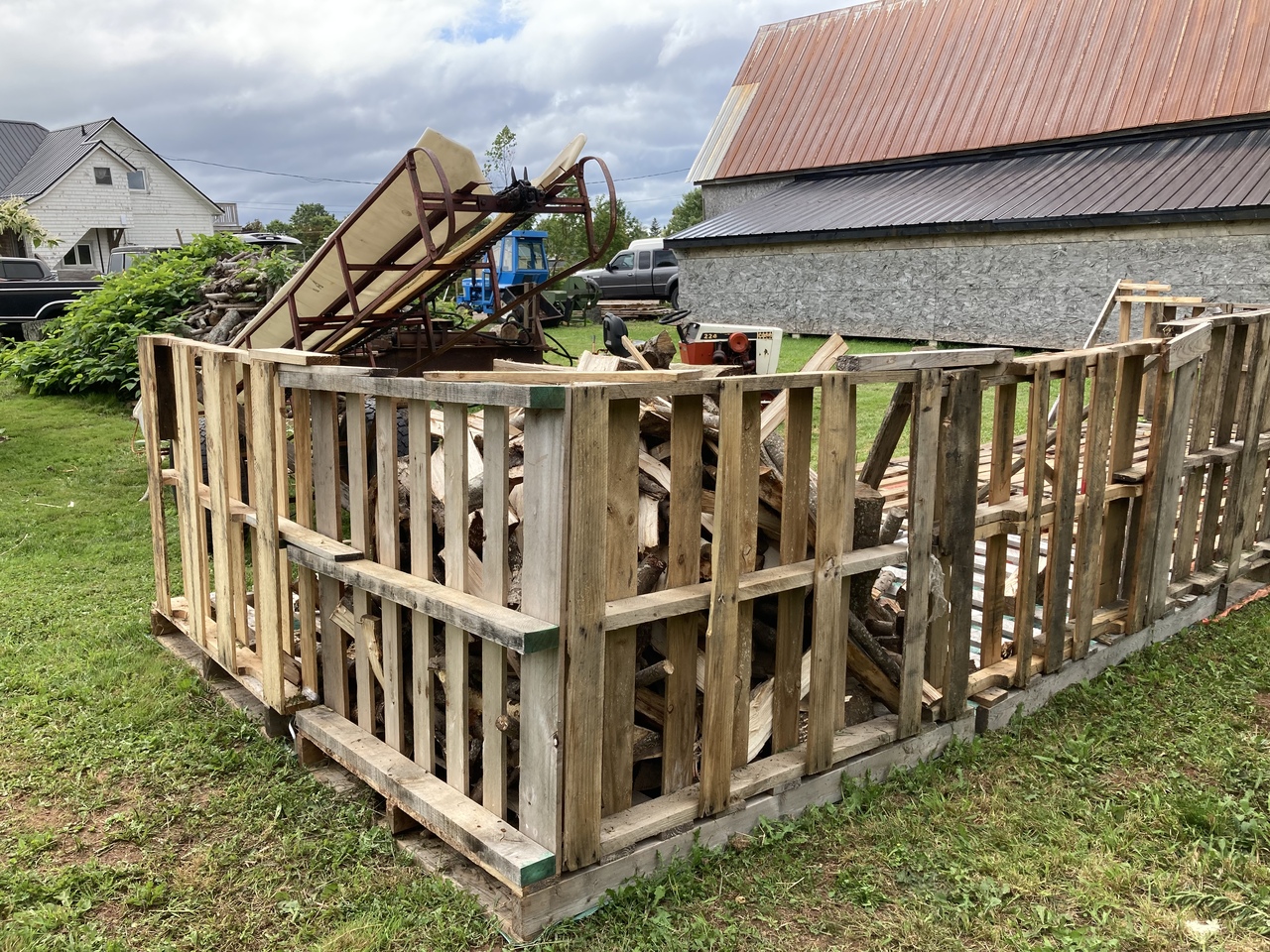 Was at the splitting of the Fiona wood, finally today and yesterday. Got a pallet bin built on Monday. And set up the equipment and started at it yesterday. Hoping to have it done by the end of September. Hehe. Nasty plant growing thru it all. Weed whacked it all off a number of times thru the summer. Grows worse that a bad weed.