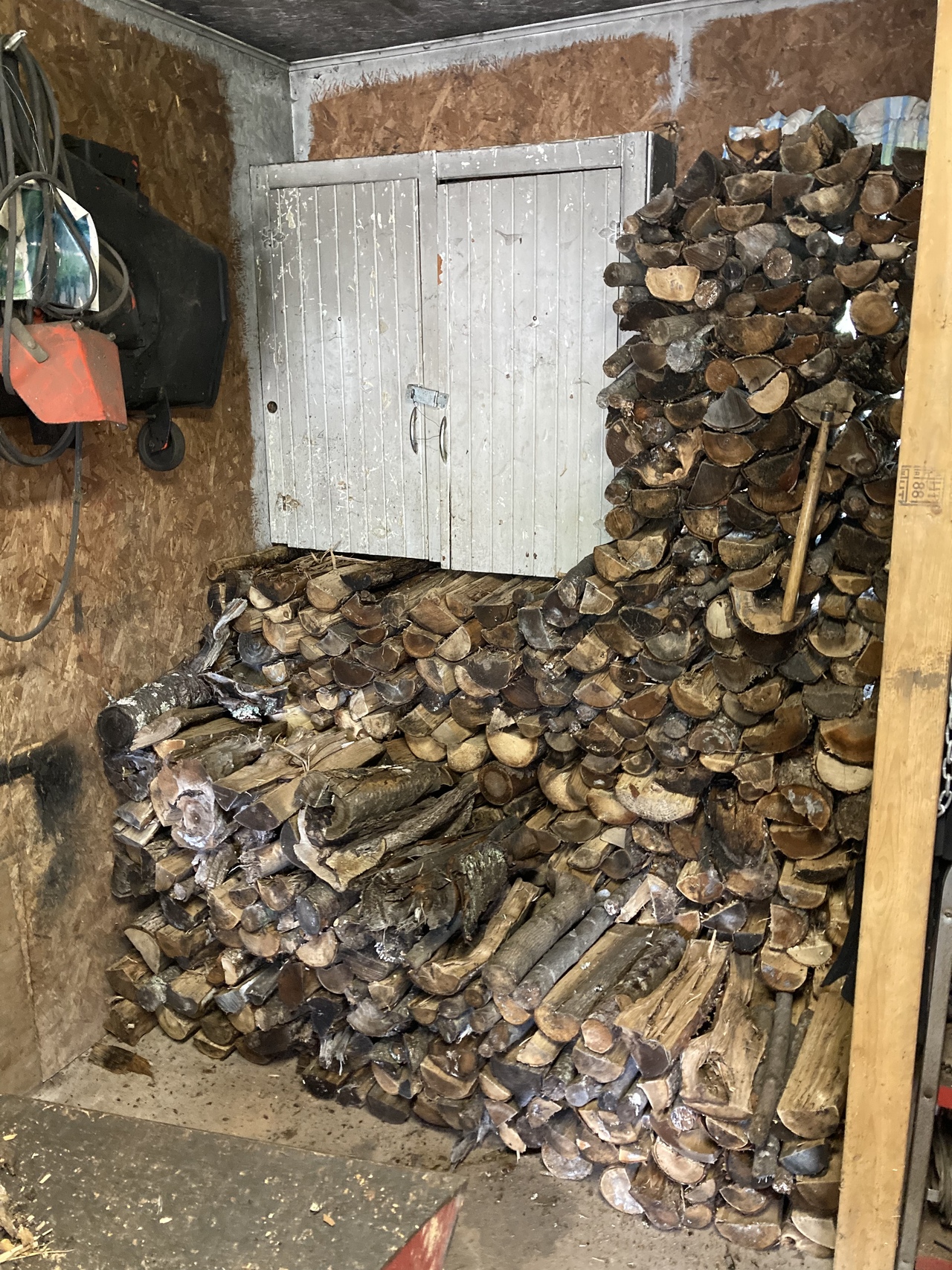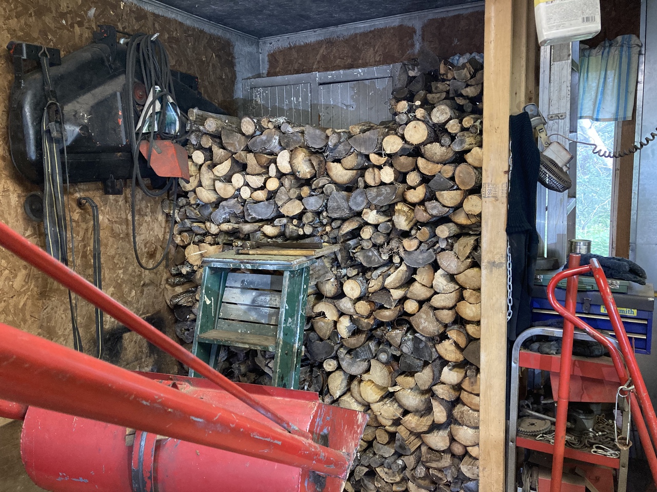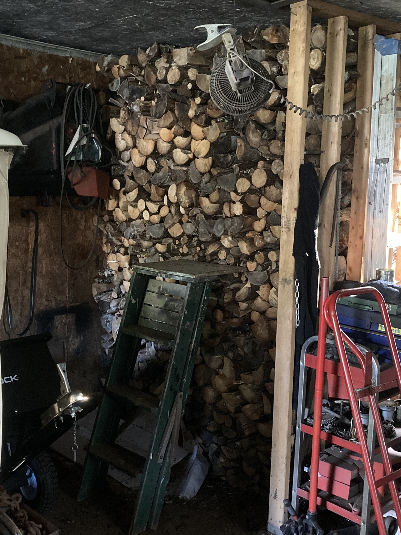 Still at the wood. And have some stacked in the garage. Loader comes in handy for that.