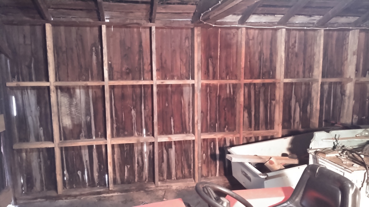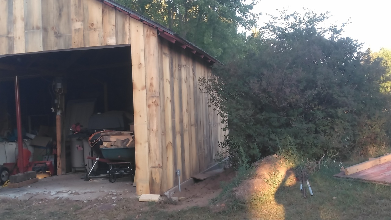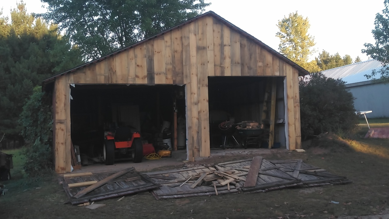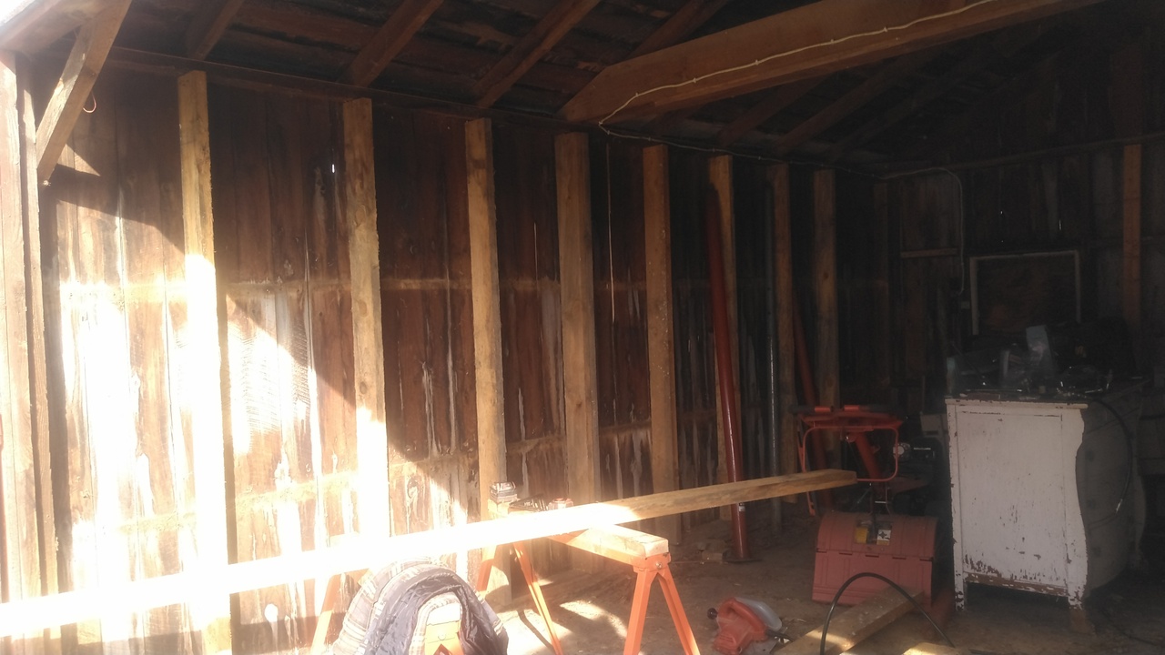 The original construction had the 2x4s running horizontal for nailers for the siding with minimal vertical support. Essentially the siding was holding up the building. The north wall now has 2x6 studs under the rafters.