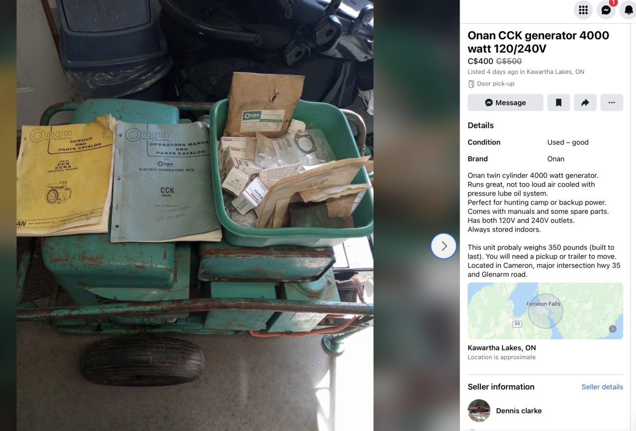 Kawartha Lakes, ON, Onan CCK generator 4kW, $400