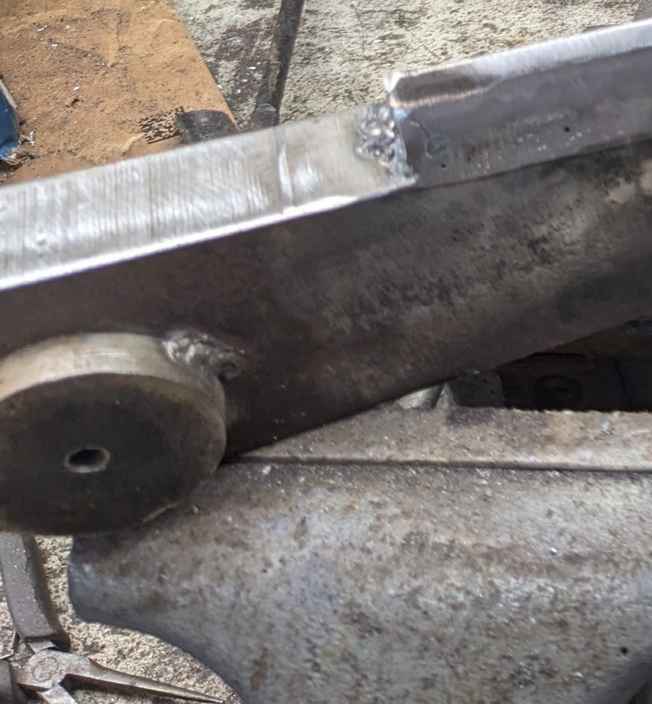 Then I pinned the new ripper bar in place and drilled and tapped it 3/8 coarse, just so it isn't swinging free. lastly I want the cutting edge to be vee shaped, just so I'm not pulling a 1" wide plane through the soil. So rather than grinding it sharp, I welded some 3/4" angle iron in place. Once that wears through it'll be easy to just replace the angle iron, so I consider it a wear item.