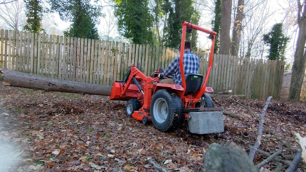 So I installed the loader (about 10 minutes. The lefthand lock pin was being extra stubborn. I may have to ream out that pin boss a bit.) and the 3 point counterweight (about 5 minutes to remove the ripper bar/ball hitch adapter and wiggle the big concrete chunk into place)