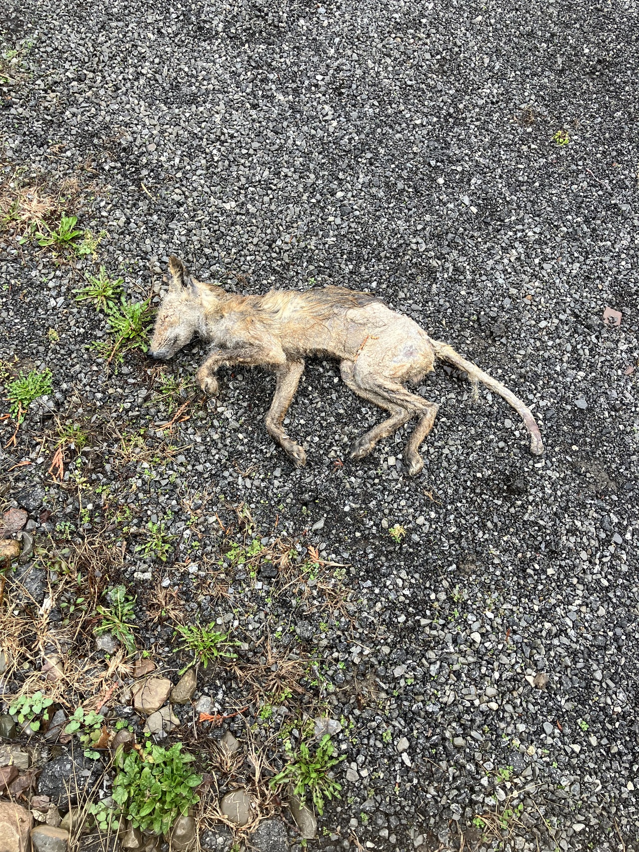 We had some thundershowers Thursday night. Yesterday morning I came across this animal at the end of my driveway. Very malnourished fox or coyote. What do you guys think?