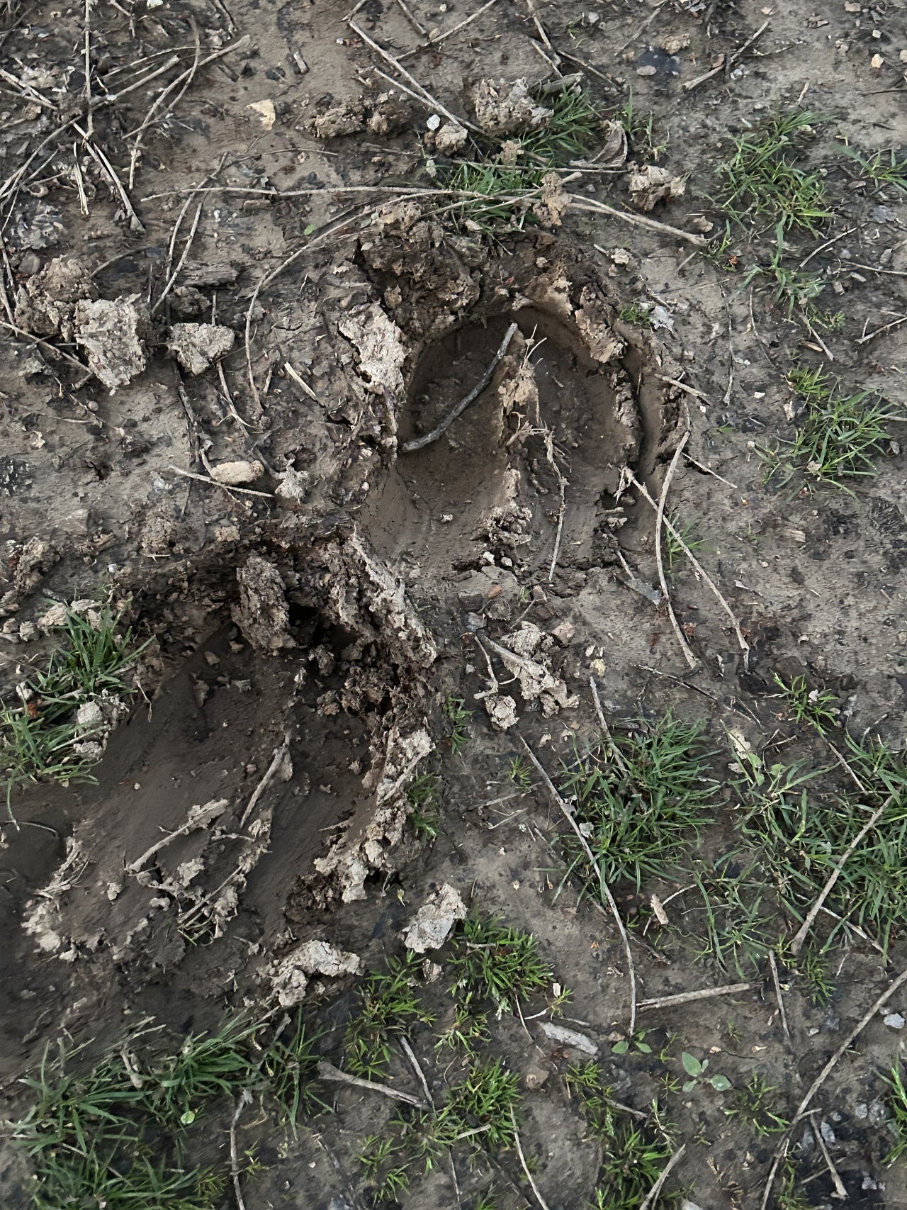 Son was tending to the chickens and spotted some tracks in the mud. The land owners around us run cattle and I guess they got spooked in the storm.