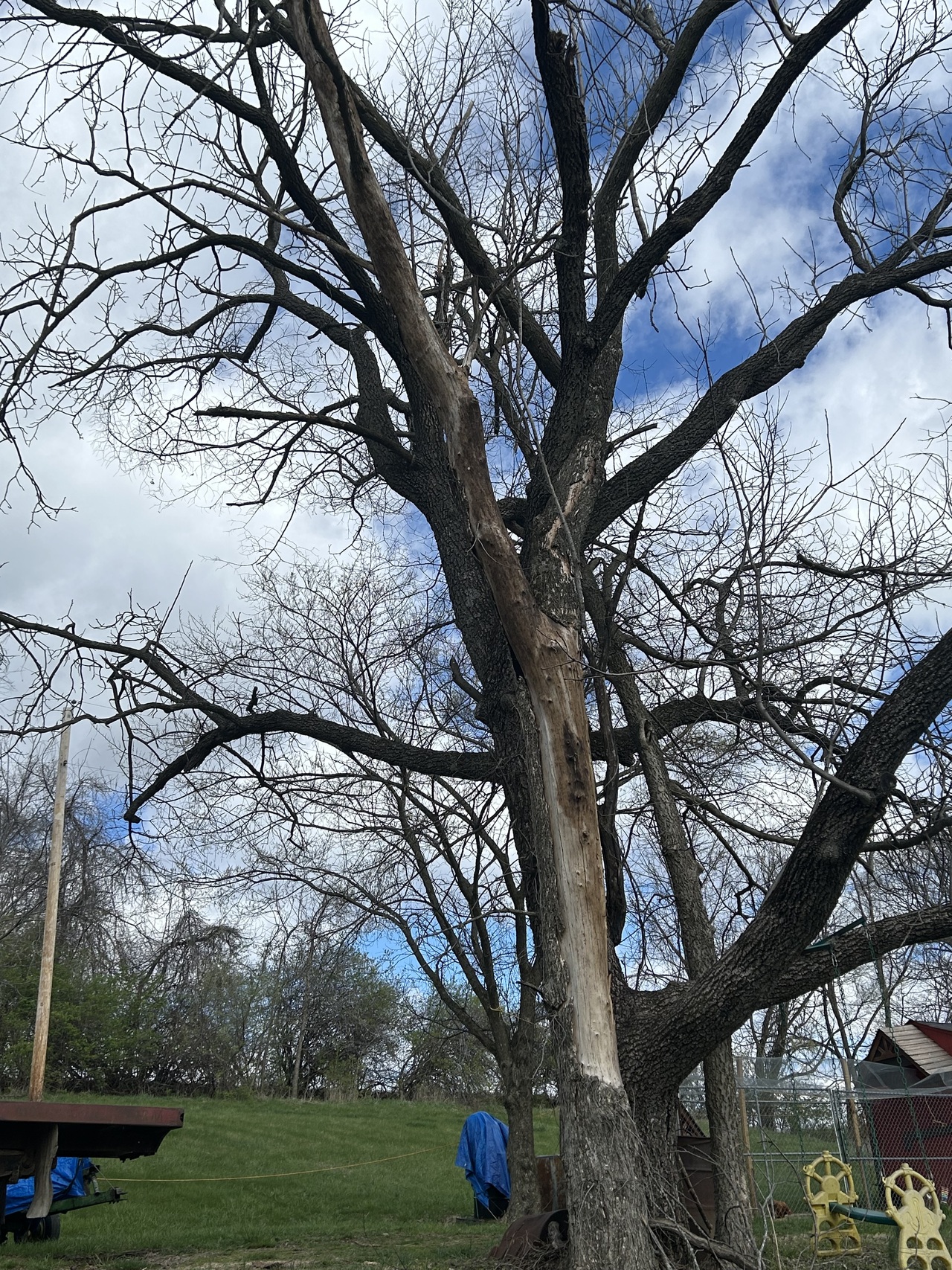 I’m convinced that tree got struck by lightning. I saw an orange fire ball and heard the thunder crack at the same time during the storm. I cleaned up around it yesterday the top of the tree was blown apart, there were pieces of wood stuck in the ground over about a 200 foot area and the bark was off almost to the ground.