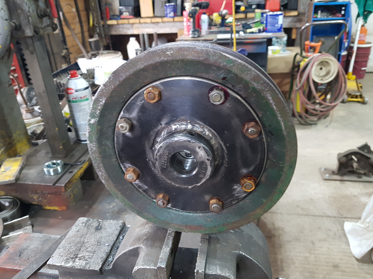 The main drive pulley for the sheller section is a 3/4" belt "C" section. V belt . grey cast iron with a worn out spline and the shaft spline was in bad shape as well . There is not enough material to bore and bush . So I brazed the bore to give me material to true up the bore and cut key way to go on new straight shaft . The hub section cracked in 3 spot when cooling .