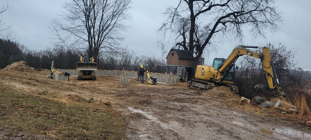 Day 5backfilling begins.outer trench gets backfilled across overhead door cutouts.Insulation was added to the below grade portion of the stem wall before backfill.A first priority was to make an access path at the front to backfill the inner trench. Both sides of the stem wall were backfilled simultaneously to relieve stress on the green wall during compaction.Backfilling the inner trench was completed 6 inches below grade and covered with 6" of A gravel.A gravel was spread and packedOnce packing was near completion laser leveling took place. The far end was shot level and the front 20 feet given a 3 inch slope in 20 feet. We finished pad grading with an hour of light rain.