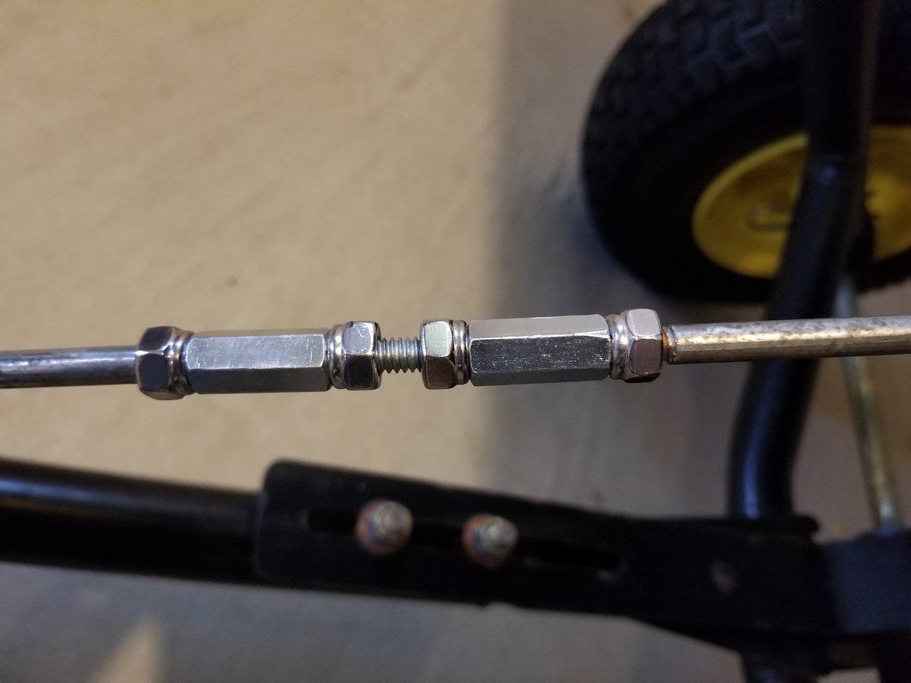 For years I've wanted to modify how much the spreader opens for a given handle movement and I finally did it. I really only use settings around 2 for fertilizer/lime and around 3 for grass seed. My plan was to lower the control rod position in the control handle lower toward the pivot point. The rod was 4" from the pivot. I drilled holes at 3" and 2" and ended up using the 2" position. The control rod had to be lengthened with about 2" of 1/4-20 threaded rod. This also allowed me to slide the control handle assembly about an inch closer to the tractor.