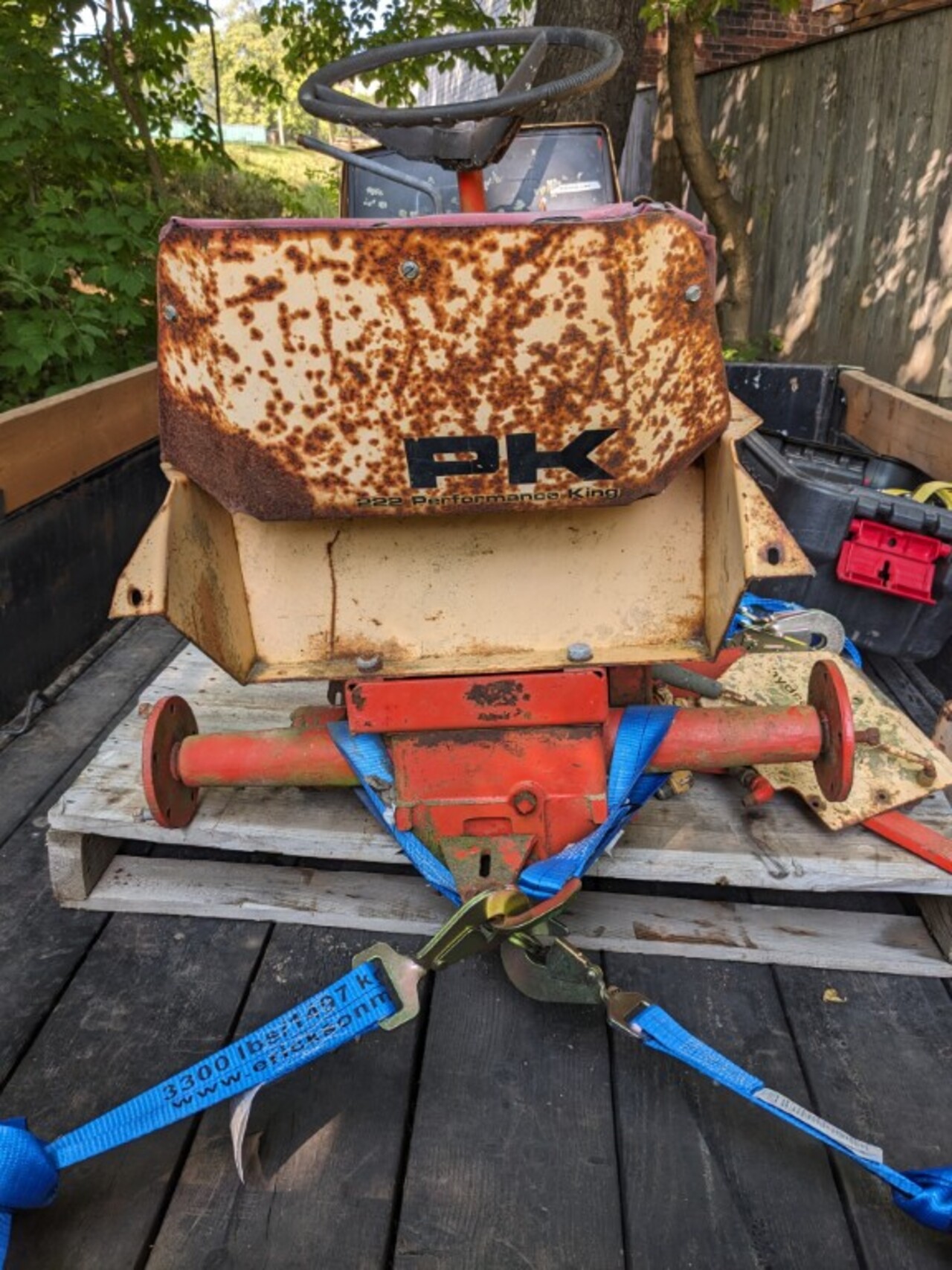 previous owner in the distant past had pushed a chunk of 1" square tube in the hole so the axle stayed in place - pretty sure I have a spare axle and pivot pin in the container up at the property - Cleaned the rust and crud off the front spindles and found I some spare hand cart / wagon wheels with the right bearing size