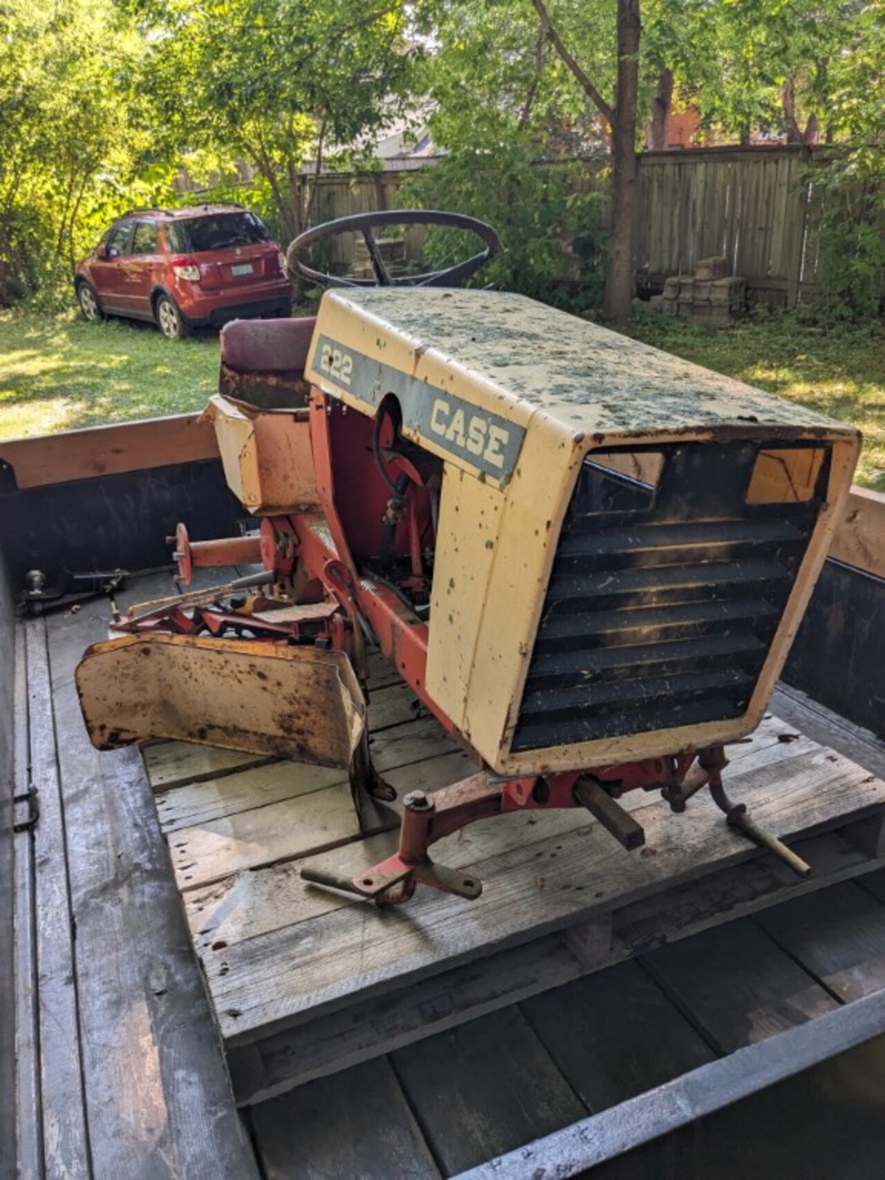 Next step was to see what I could find to use for wheels on Crusty... I recently changed front tires/rims on my yellow 644 loader, and still had the old front wheel assemblies kicking around in my piles of junk - they are the right bolt pattern for the rear axle - but the 222 uses smaller diameter bolts... (it's good enough for now
