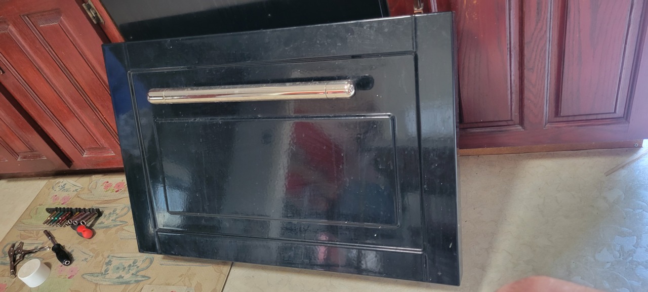 I thought a stainless oven door on a black stove would look good, especially since Merri is planning on redoing our kitchen counter top in stainless steel.