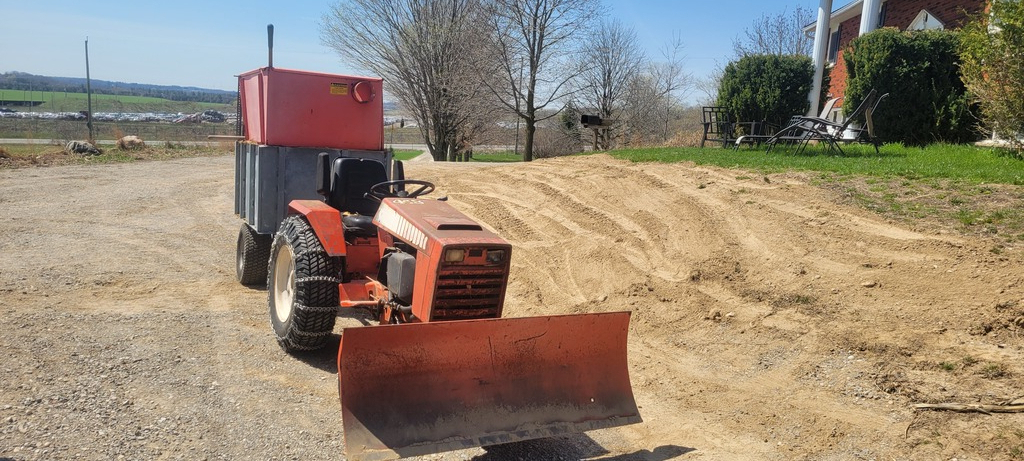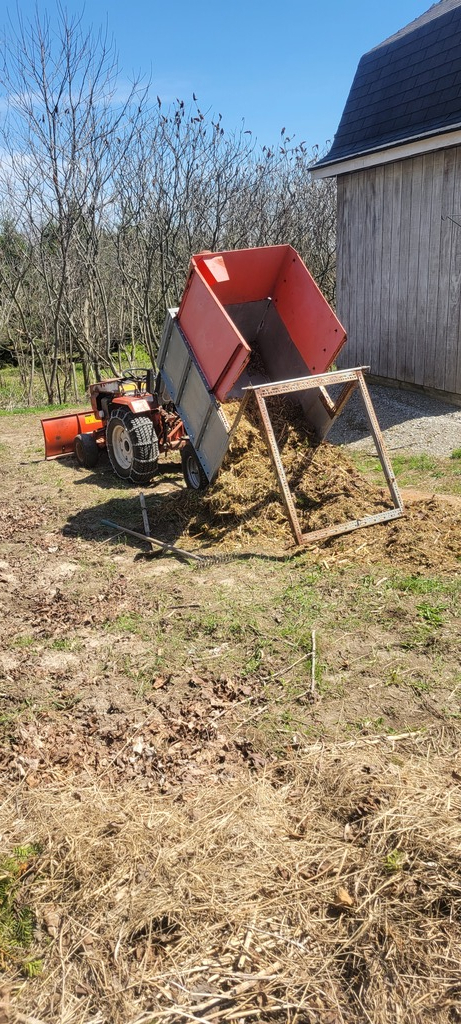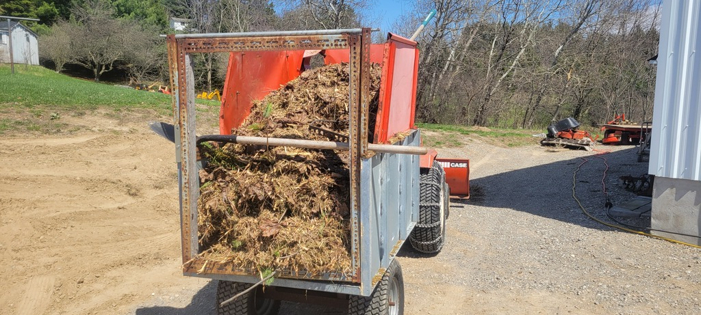 ]448 multi task this week. After throwing the blade on and contouring the front yard in preparation for a load of topsoil, the trailer was attached.Moved the chips from the back yard to garden side.It was a fair sized load.