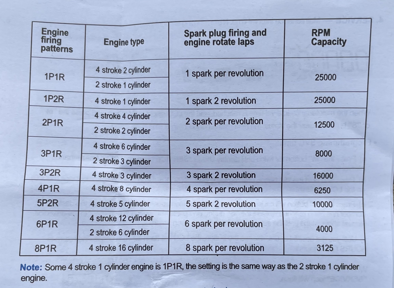 Supposedly you can set it up for a number of firing patterns. I set it at 1P2R on the 644 which is a spark every two revolutions, or 4 stroke 1 cylinder.