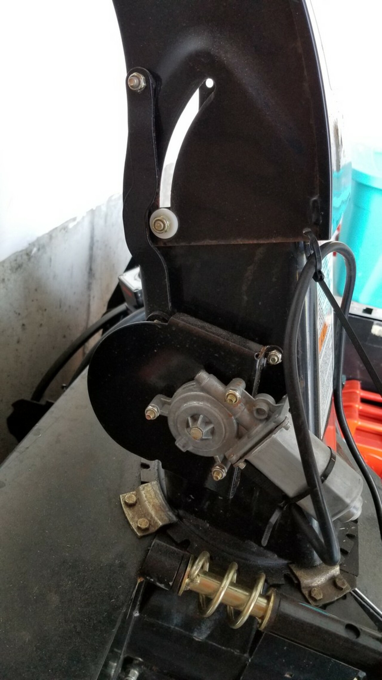 Then the chute tilt you drill and tap the motor traveler nut and jam nut that to the nut and the chute. Use spacers and such to mount the motor. The closure you are to the pivot point the more motion you will get out of the motor.