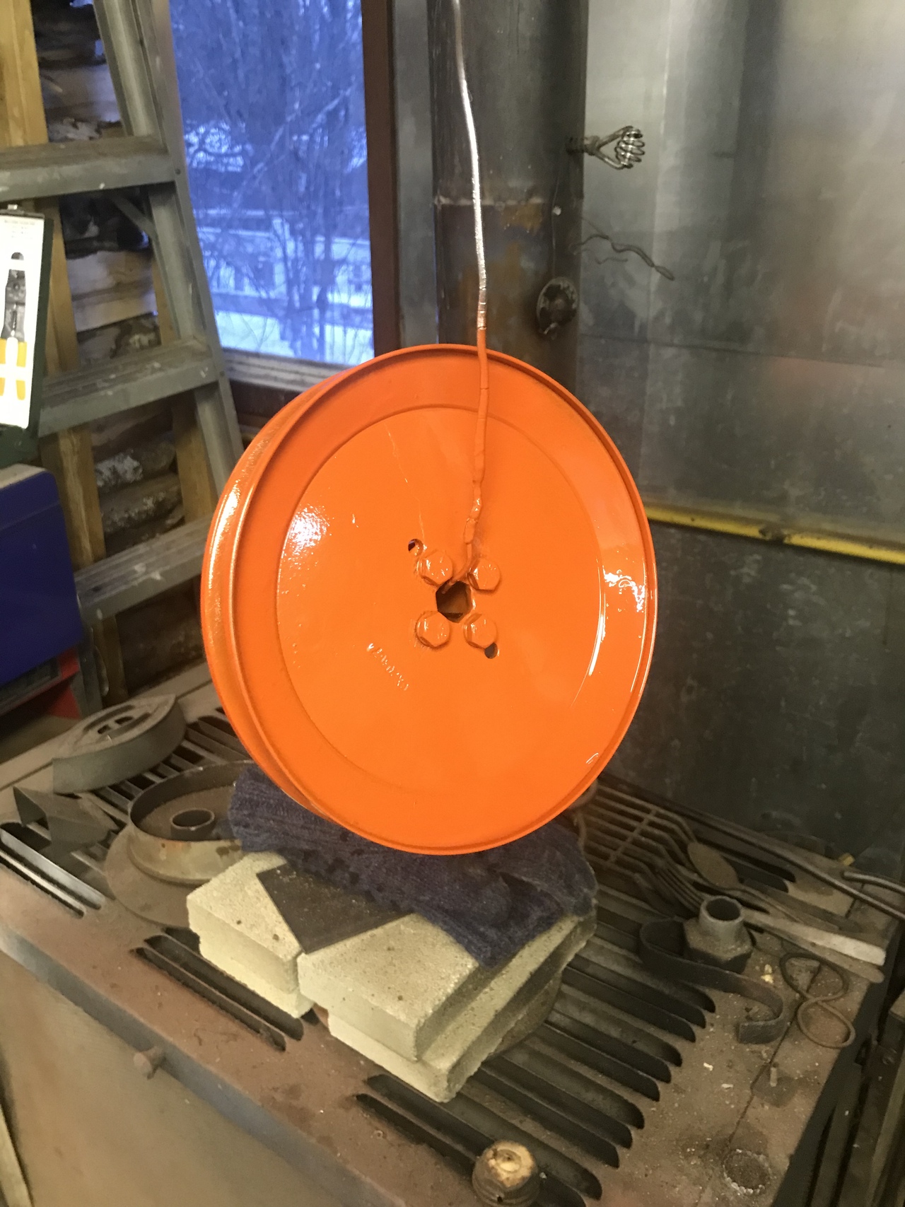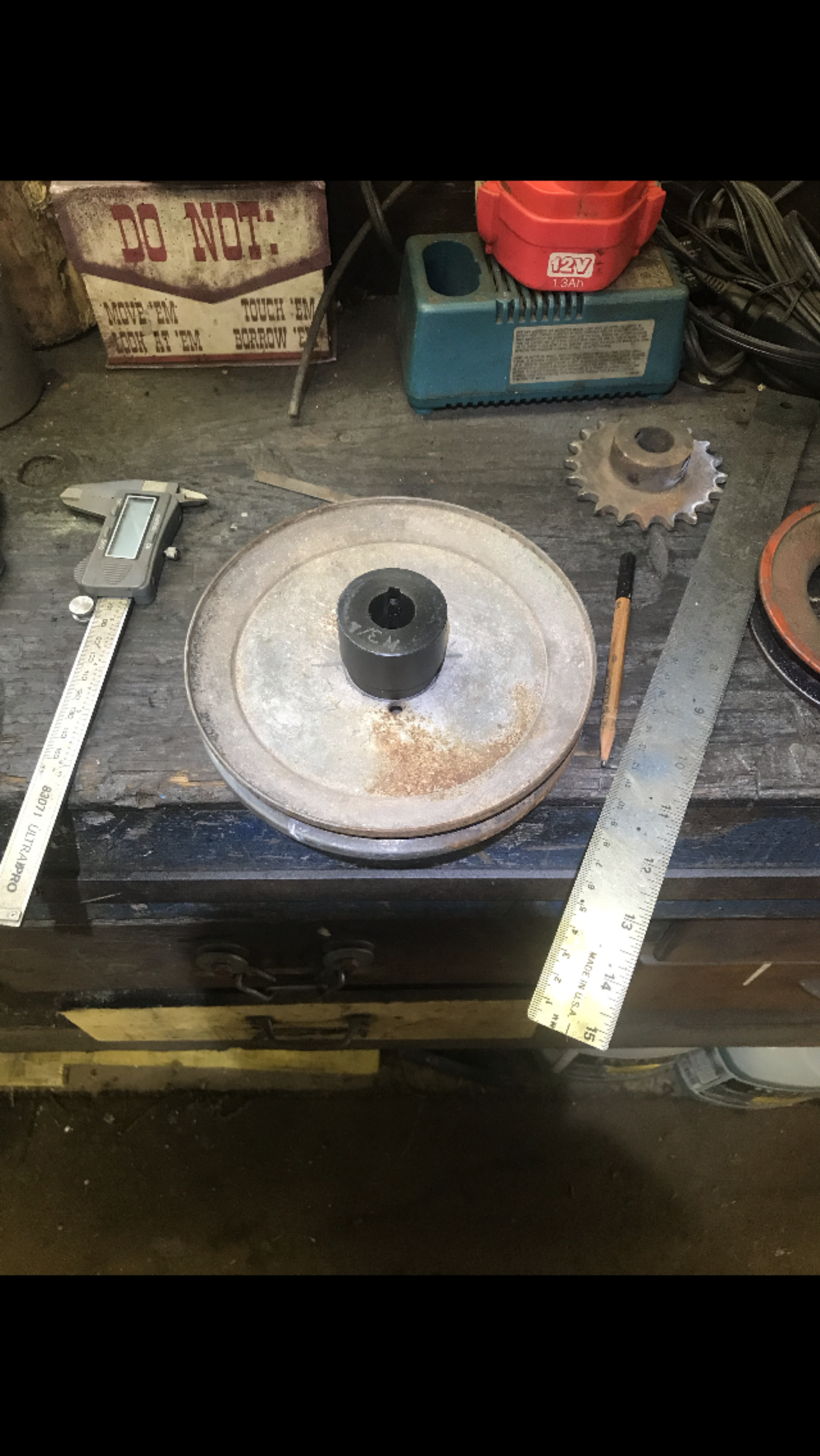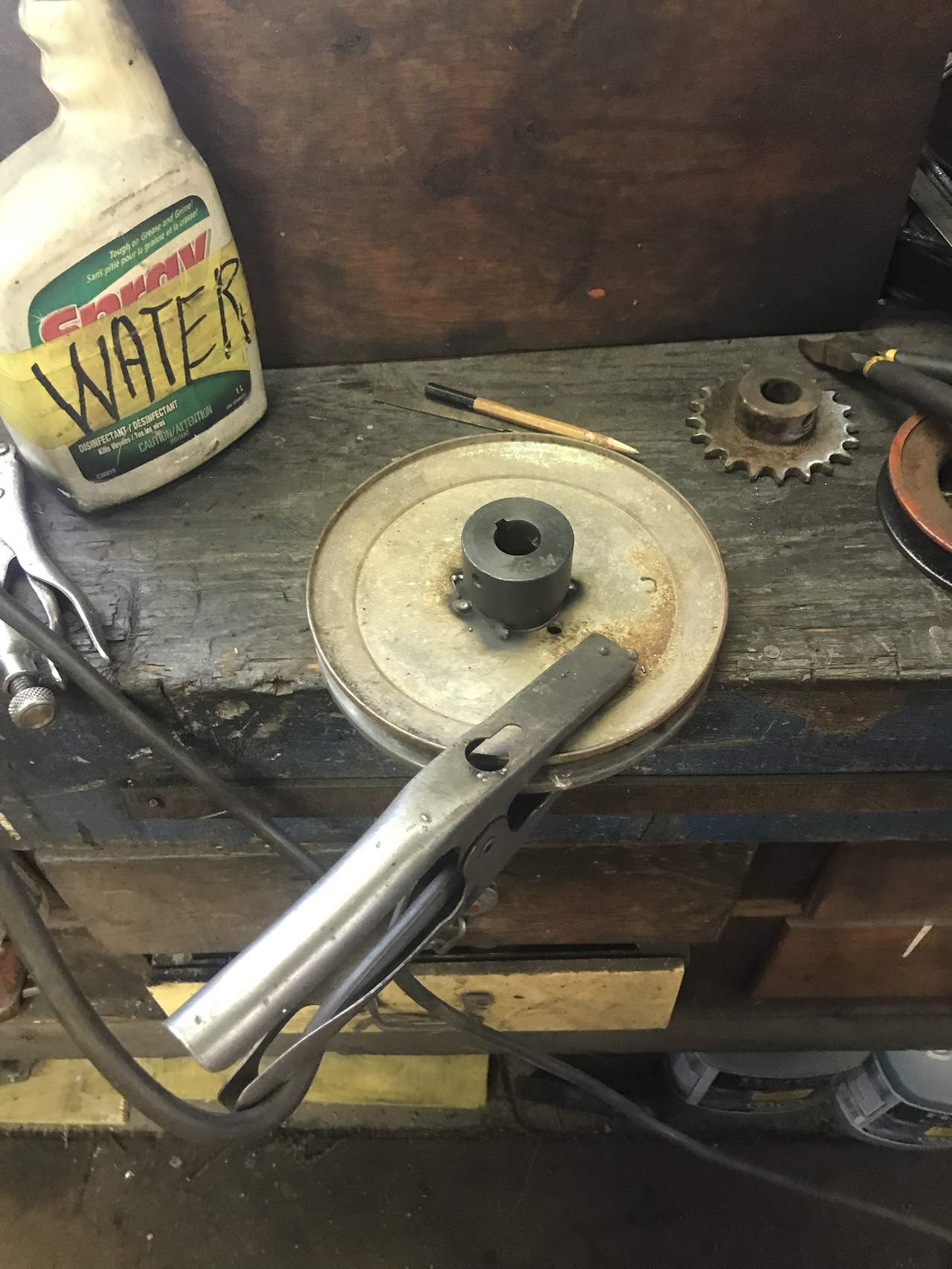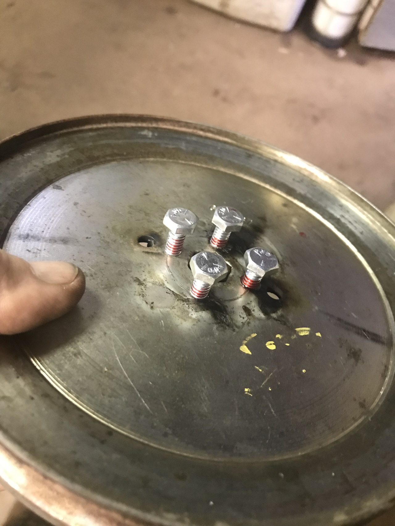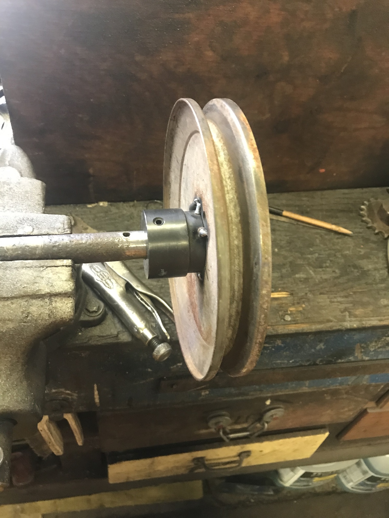 Because my welding is not the greatest, I tack welded the the shaft thing on. I put it on a 3/4 pipe and rotated it. Wanting to see if it was centered. It was good. My machinist skill you know. Then I drilled and tapped four holes thru the pulley and into the weld on thing. Cut inch 1/4 bolts to down to half inch. Some lock tight and lock washers put in. Painted the new pulley assembly.