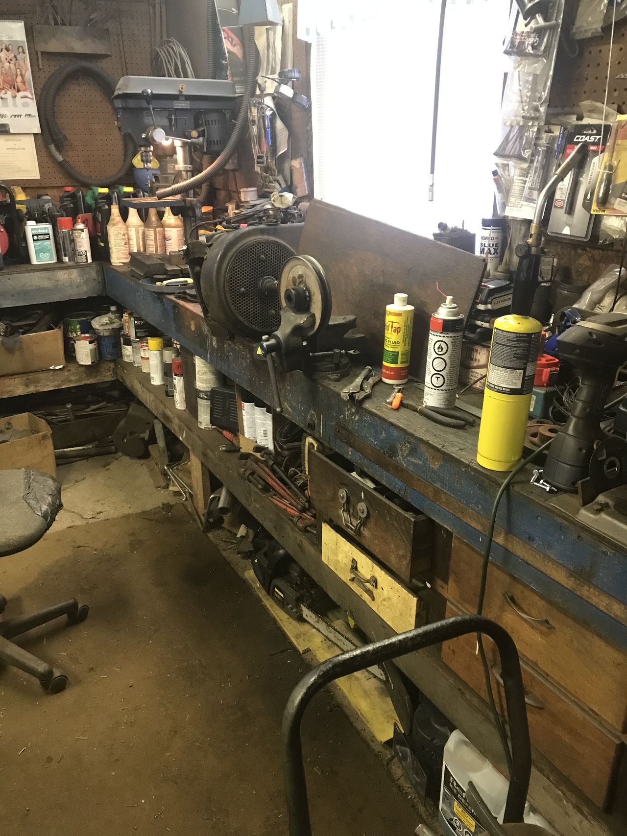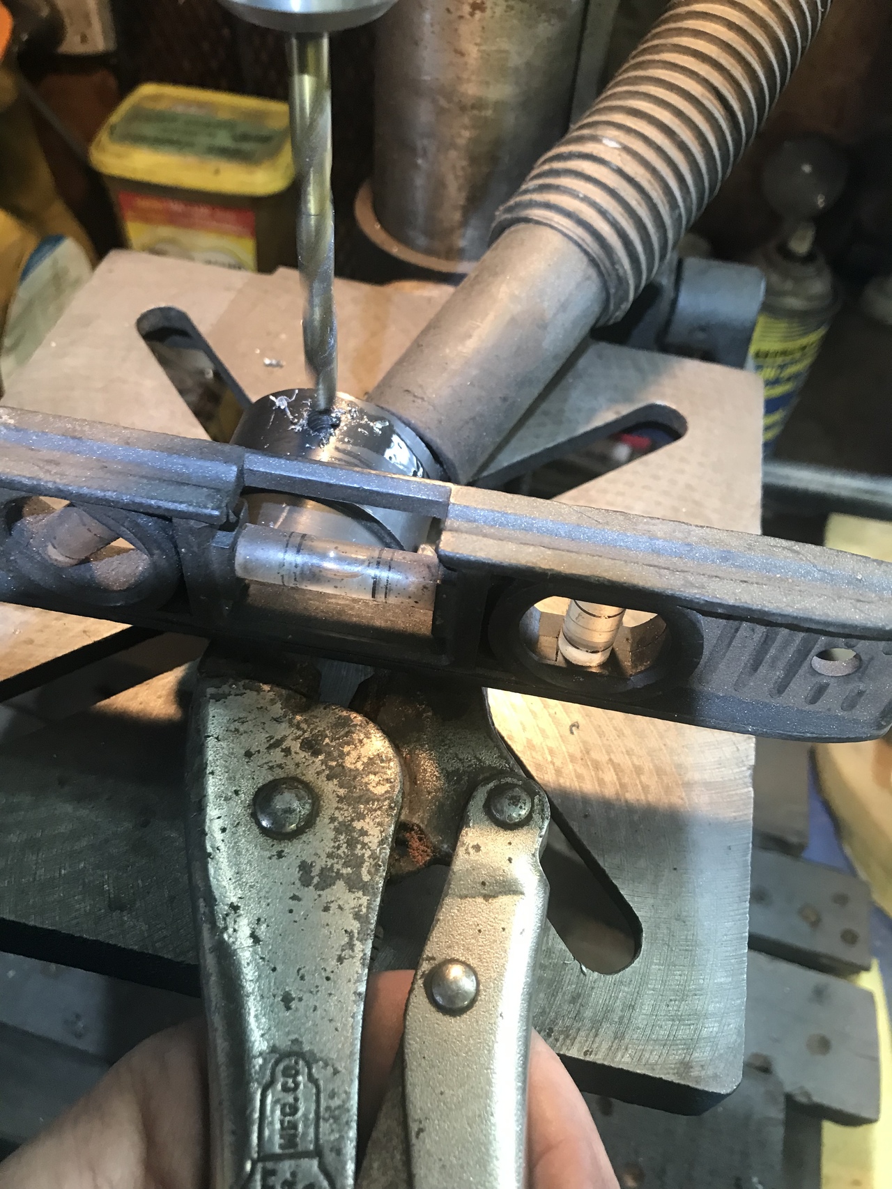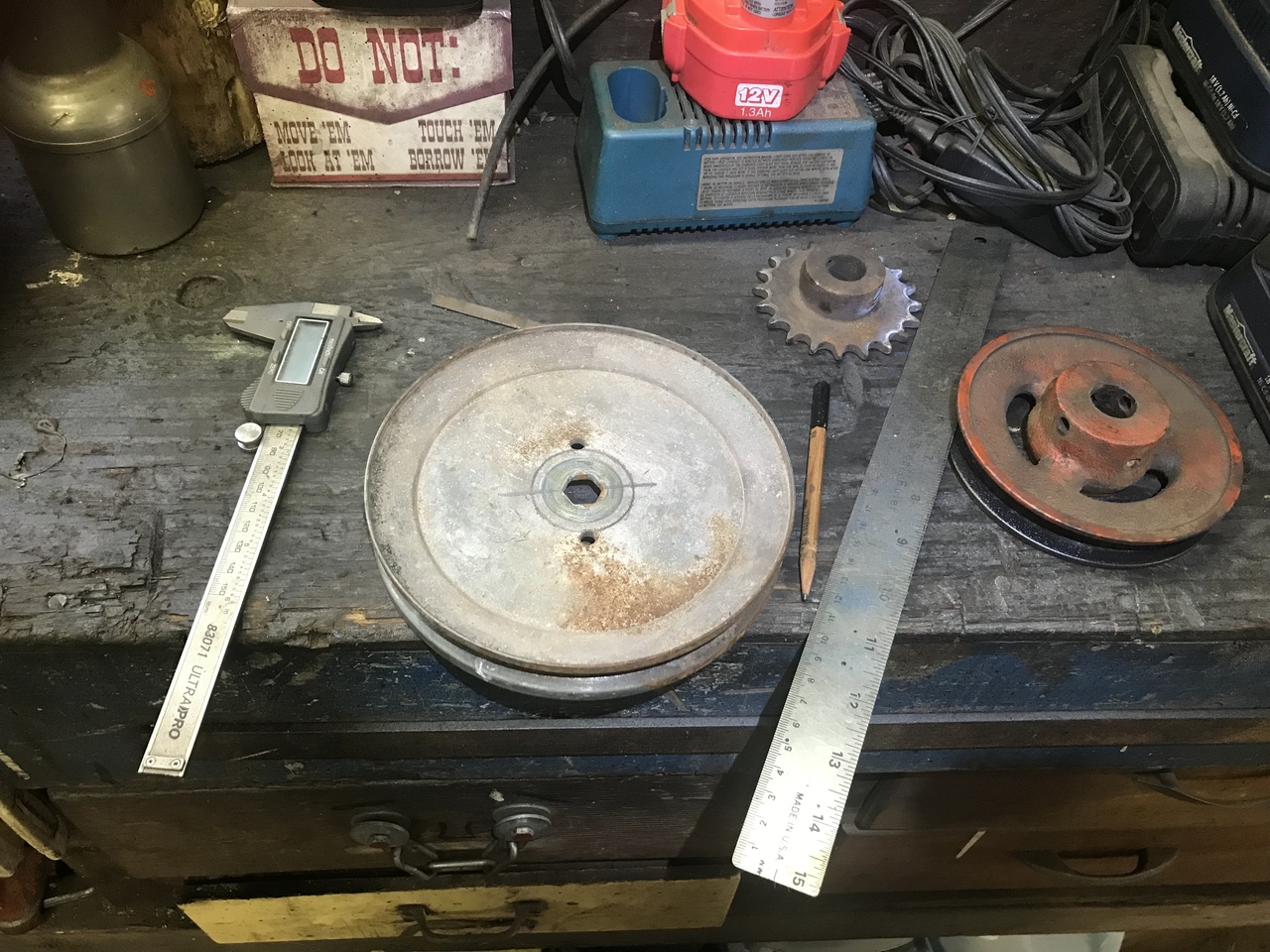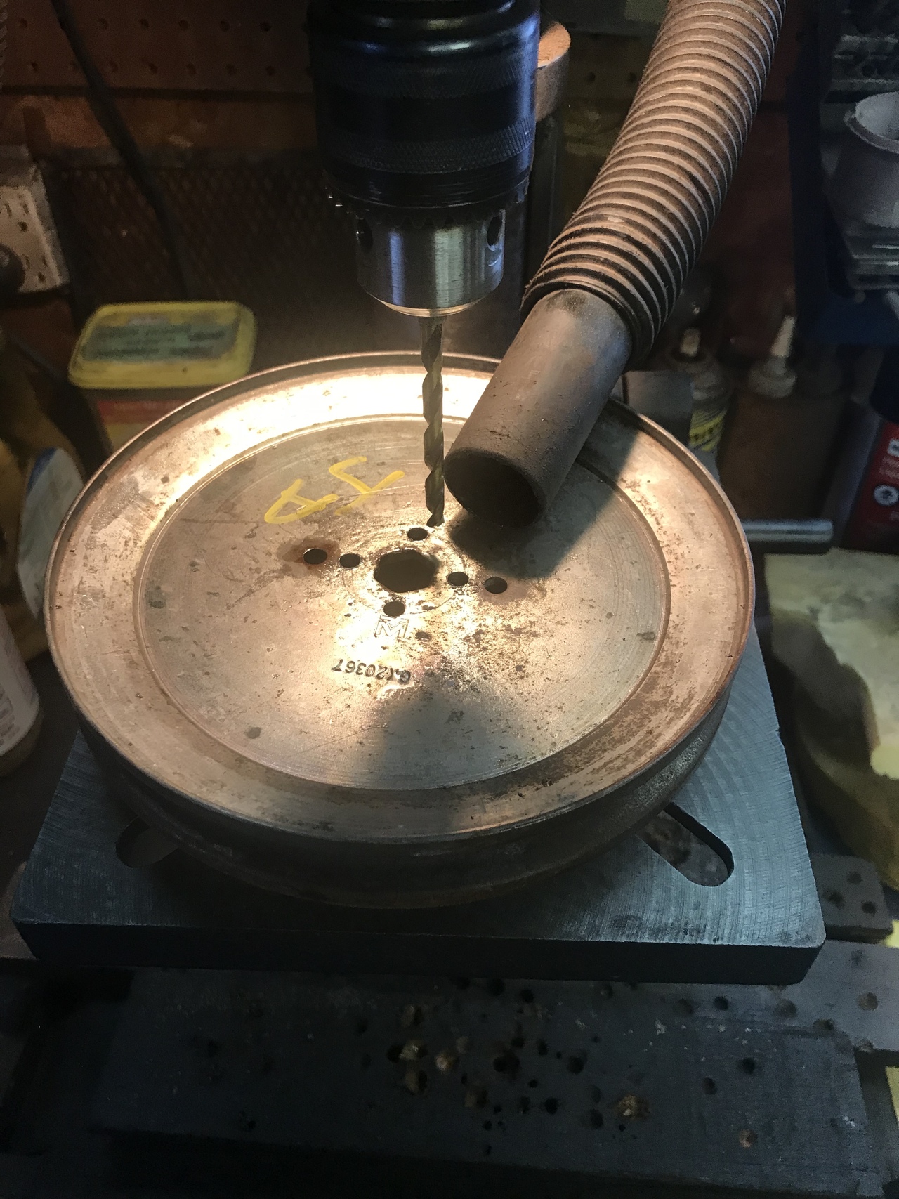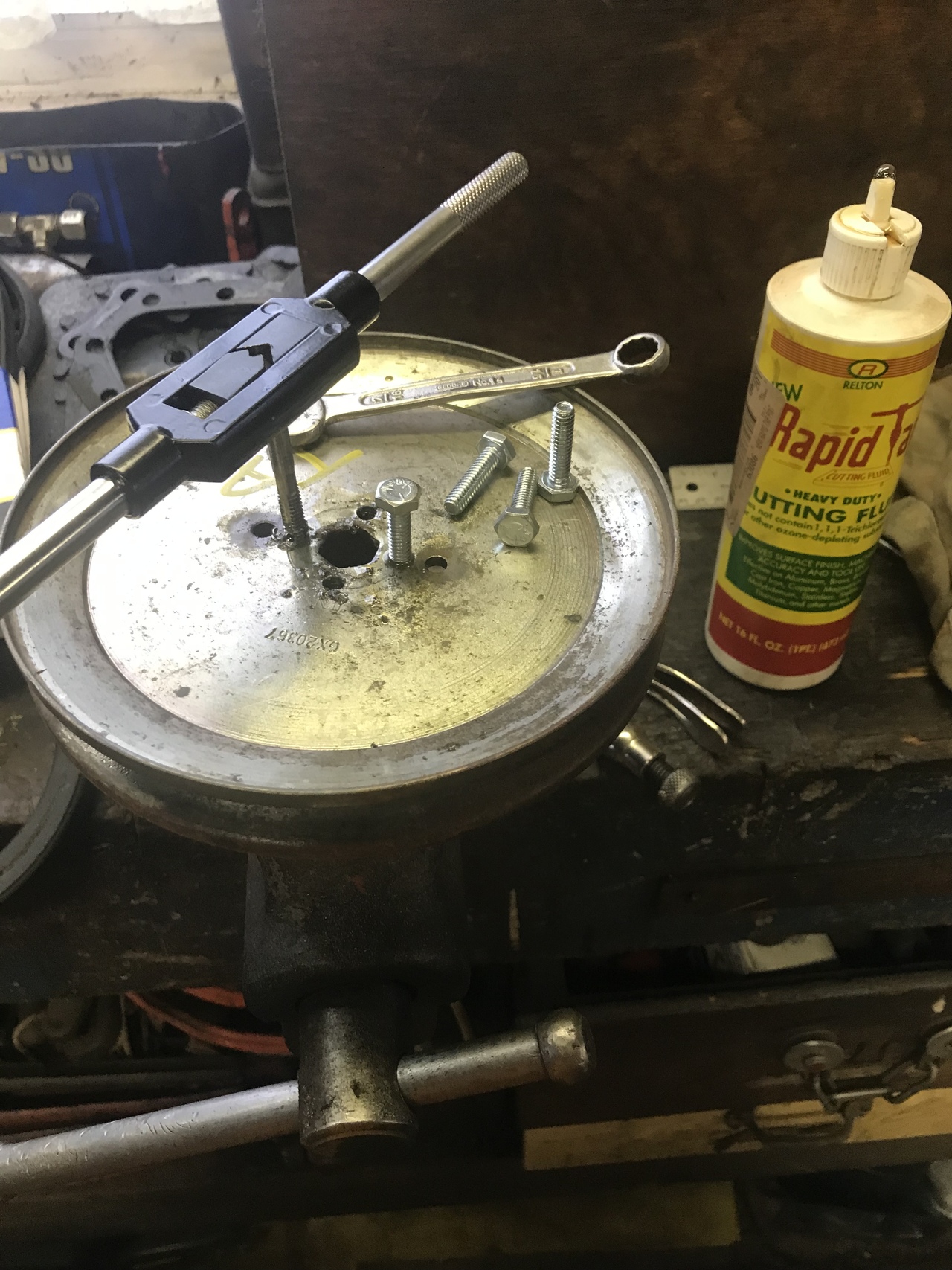 Because my welding is not the greatest, I tack welded the the shaft thing on. I put it on a 3/4 pipe and rotated it. Wanting to see if it was centered. It was good. My machinist skill you know. Then I drilled and tapped four holes thru the pulley and into the weld on thing. Cut inch 1/4 bolts to down to half inch. Some lock tight and lock washers put in. Painted the new pulley assembly.