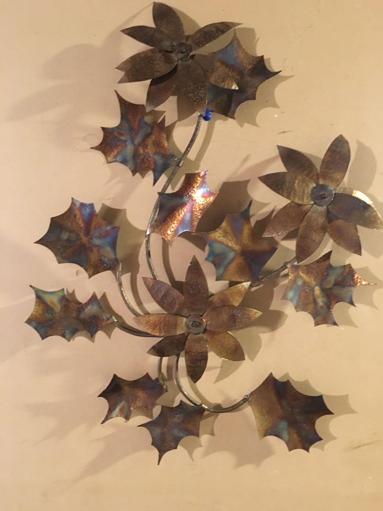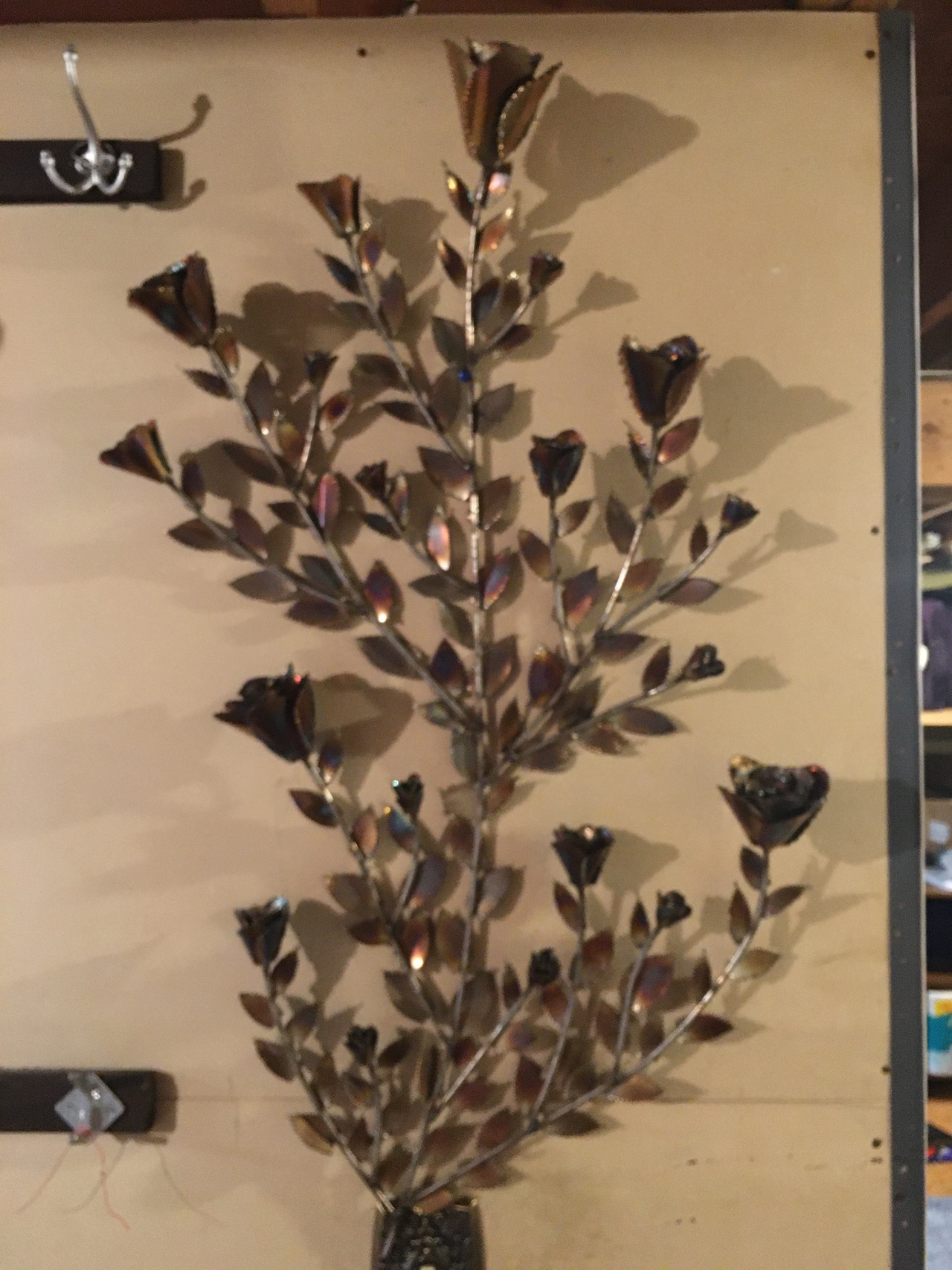 Here are a few more that I display in my house. These are all made from 316L stainless steel. One place I worked at had a lot of this as scrap material. I was doing a repair on a heating element in an electric furnace which was made out of inconel which has a lot of nickel in it. The furnace was just heated up after an annual service when the heating element shorted out. The walls were covered in the 316L SS and when I went in after it cooled down, it looked like a rainbow inside. I then experimented with some of the scrap and found out with a little heat the SS would turn golden. A little more heat it would turn purple. A little more heat would turn it brilliant blue. Any more it would turn black. So by varying the heat in the flowers I could color them.