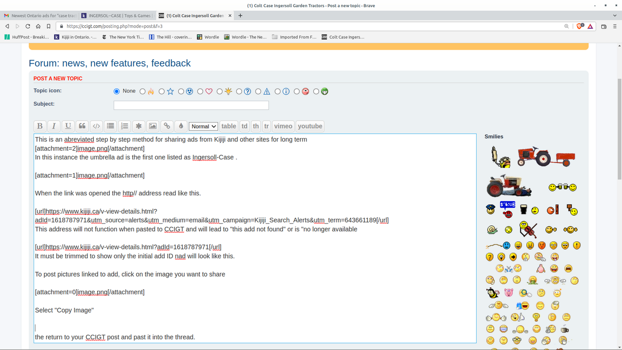 Thank you @Spike188 ! One of the things I noticed is that such operations are both browsers specific and OS specific. For instance I can drag an image from one window to another in Safari, the native browser of MacOS and it inserts the link to the Kijiji ad. I wish there was a feature in the site forum software that could creste a post automatically from a craigslist or kijiji ad.