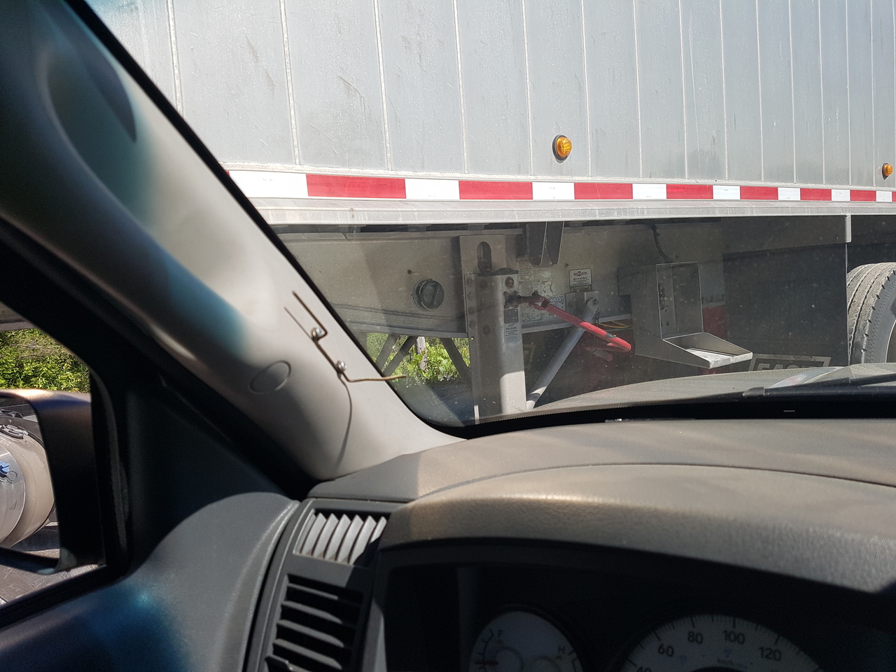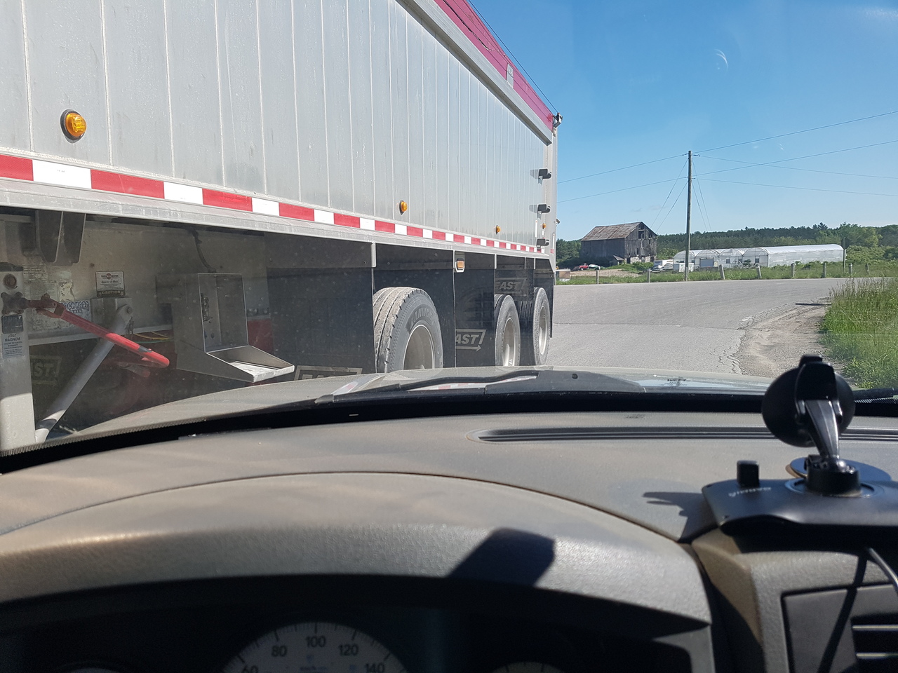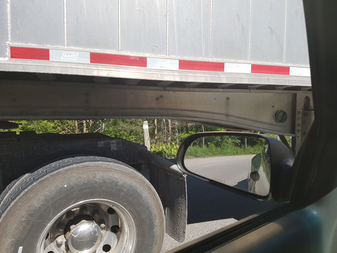 Pics. from the drivers seat of my truck . So close I could not open drivers door . And that was with almost putting in the ditch to avoid be hit . in the 10 years we have been here , this would be about 30th time this has happened . Now back to feeling better , back to battling the powers that be to do something about it .
