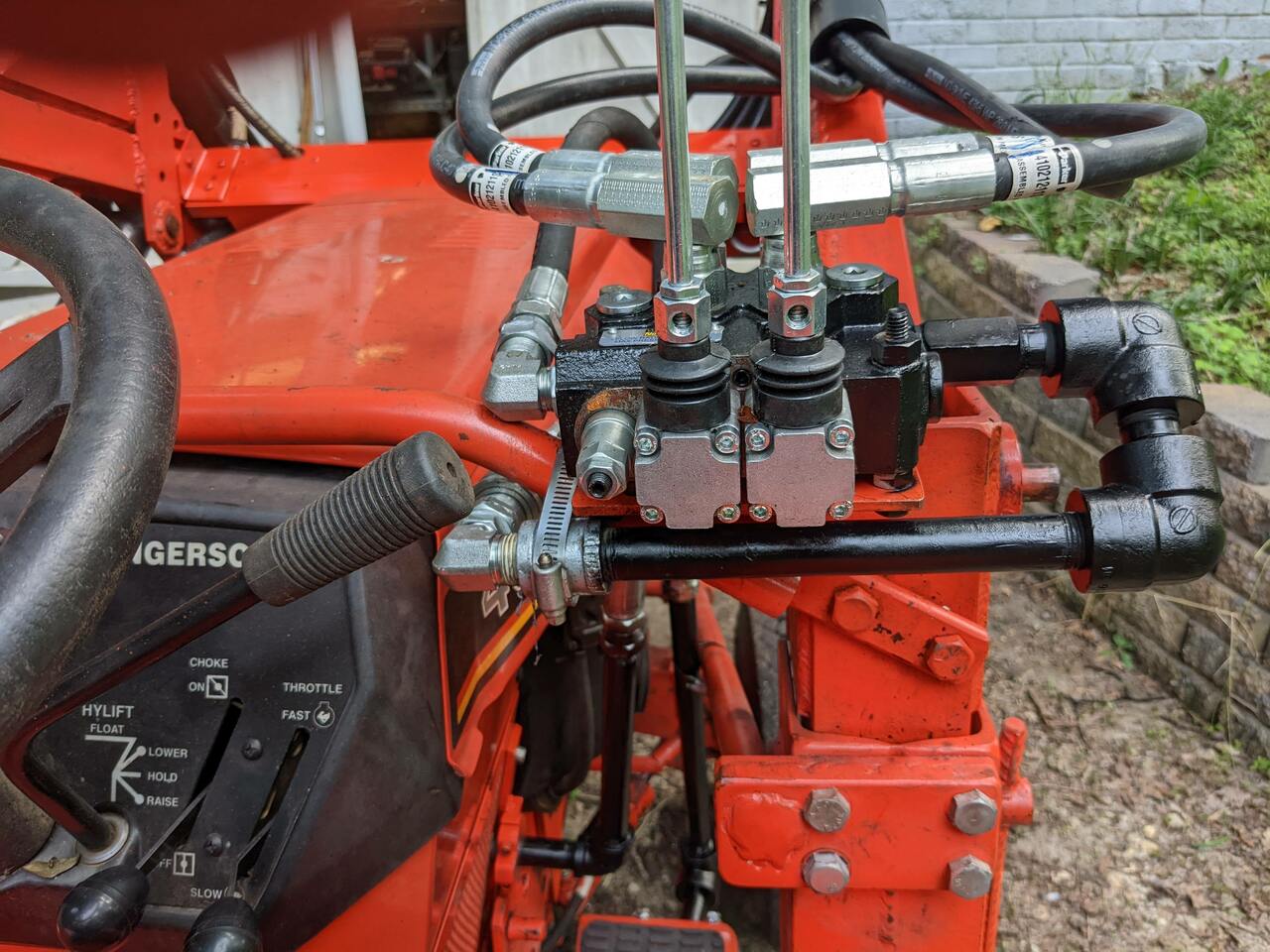 The pipe coming out of the loader valve was kind of hanging in free space, so I clamped its far end to the loader structure, since that end is where the strain of handling happens. Without a clamp there, the torque applied by vibration and handling will eventually loosen up the joints of that pipe as it runs over underneath the loader valve.