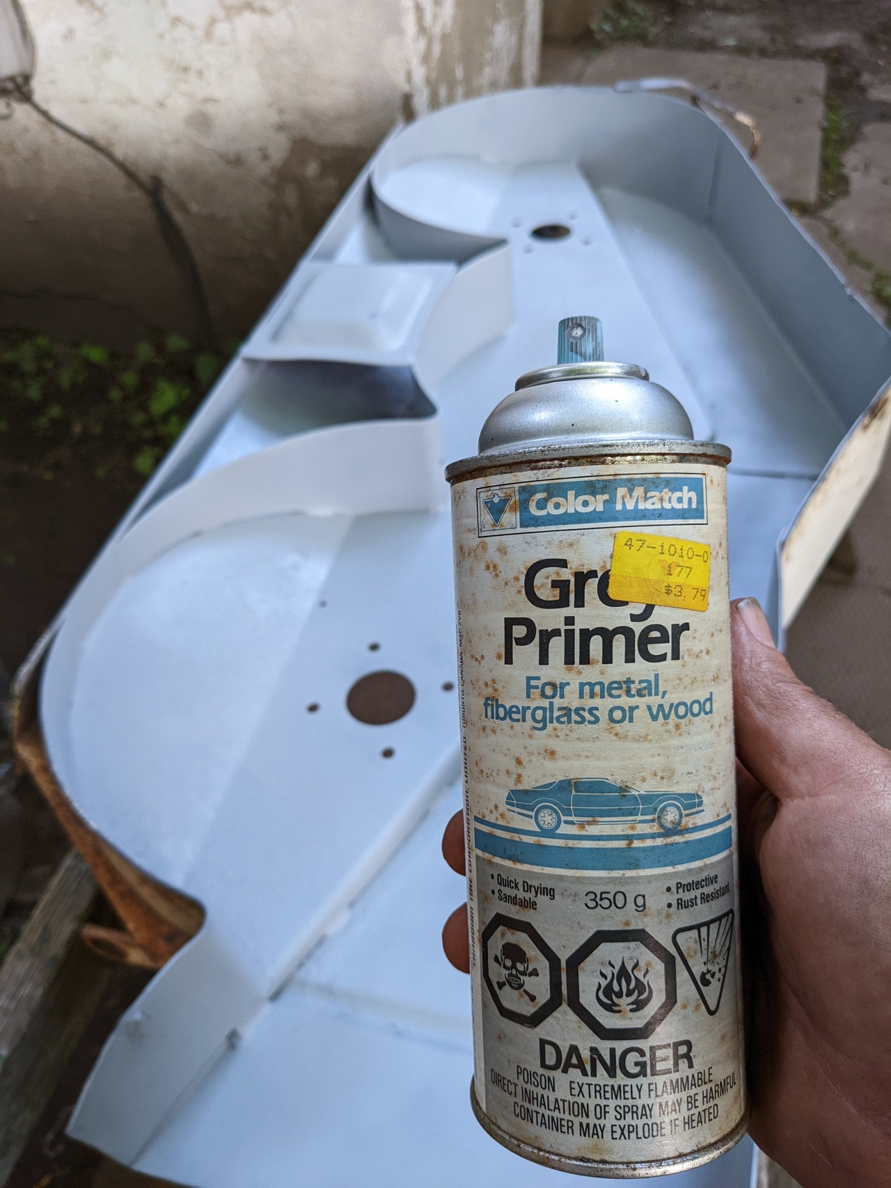 Spindles were removed for cleaning and new bearings and the deck was wire brushed and sanded before getting a couple of coats of Rust Check Converter/Primer and followed up with a topcoat of Tremclad Gloss White on the inside - This old Can of Primer was found in my Dad's old apartment - probably dates back to the 1970's - (no bar code on the can) Check out the price tag - only $3.79